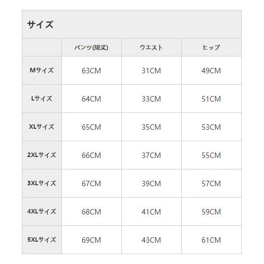 | サイズについての説明 | 【サイズ】Mサイズ パンツ(総丈)63CM ウエスト31CM ヒップ49CM Lサイズ パンツ(総丈)64CM ウエスト33CM ヒップ51CM XLサイズ パンツ(総丈)65CM ウエスト35CM ヒップ53CM 2XLサイズ パンツ(総丈)66CM ウエスト37CM ヒップ55CM 3XLサイズ パンツ(総丈)67CM ウエスト39CM ヒップ57CM 4XLサイズ パンツ(総丈)68CM ウエスト41CM ヒップ59CM 5XLサイズ パンツ(総丈)69CM ウエスト43CM ヒップ61CM |