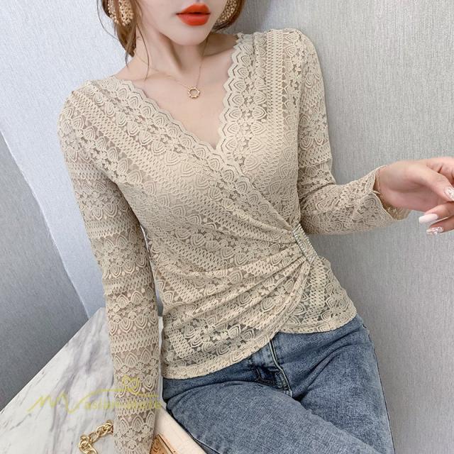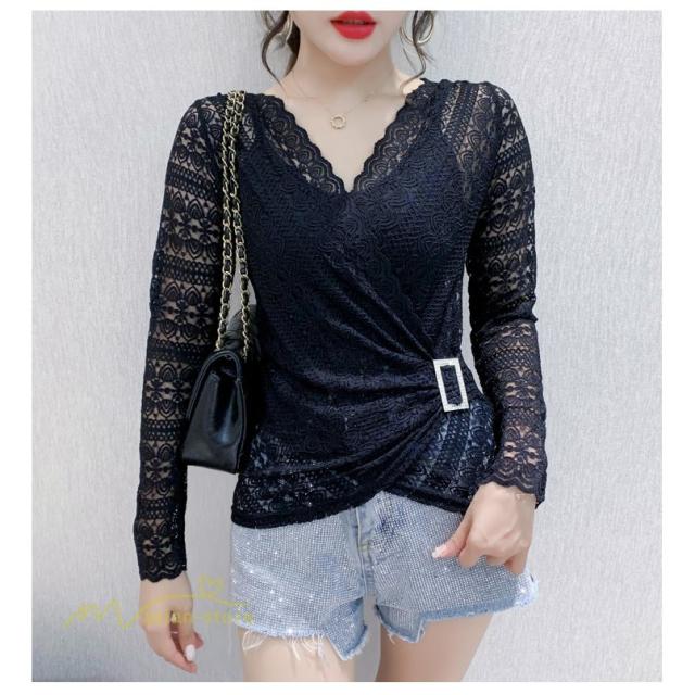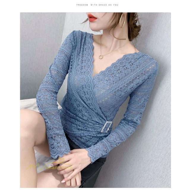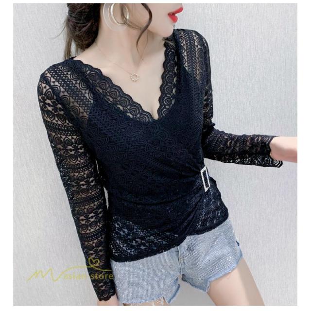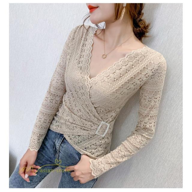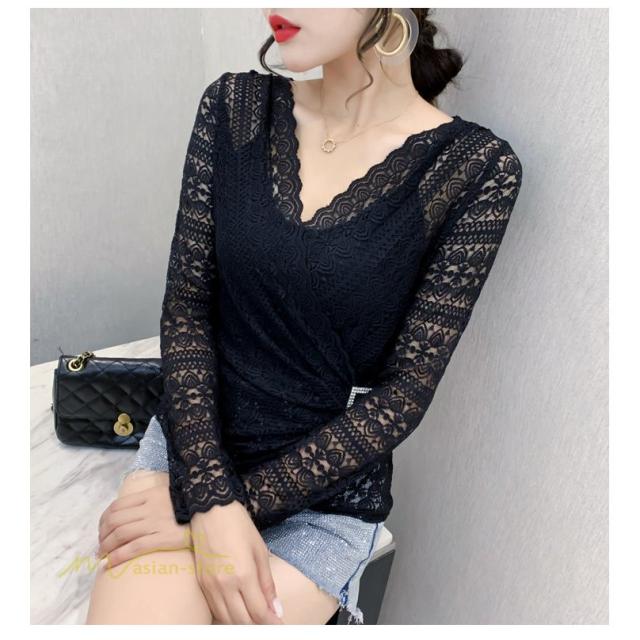 総レーストップス レディース ブラウス 長袖Tシャツ 透け感 Vネック 無地 シンプル 花柄レース ファッション カシュクール セクシー お出かけ 着回し きれいめ