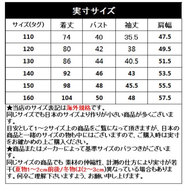 | サイズについての説明 | サイズ: 【110】着丈/74バスト/40袖丈/35.5肩幅/47.5(cm) 【120】着丈/80バスト/42袖丈/38 肩幅/49.5(cm) 【130】着丈/86バスト/44袖丈/40.5肩幅/51.5(cm) 【140】着丈/92バスト/46袖丈/43 肩幅/53.5(cm) 【150】着丈/98バスト/48袖丈/45.5肩幅/55.5(cm) 【160】着丈/104バスト/50袖丈/48 肩幅/57.5(cm) |