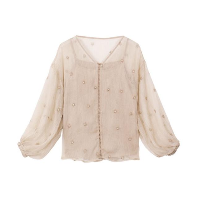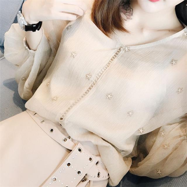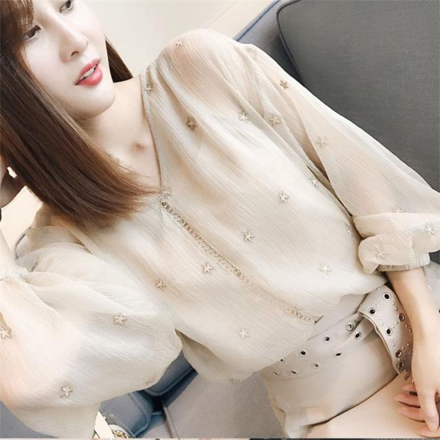 ブラウス レディース 春秋 おしゃれ 長袖 パフスリーブ 星柄 とうめい フリル シフォンブラウス リボンネック 韓国chic シャツ トップス通勤 着痩せ新作
