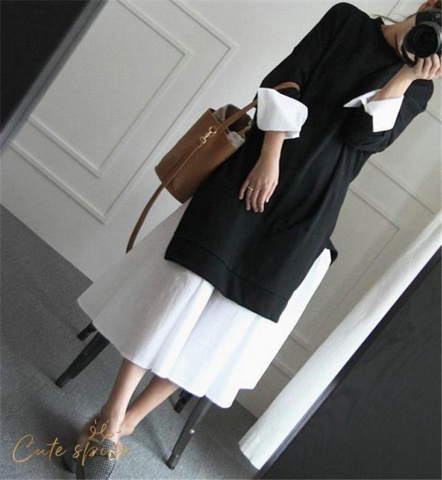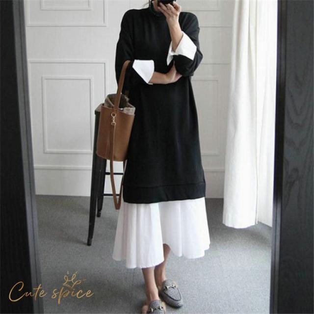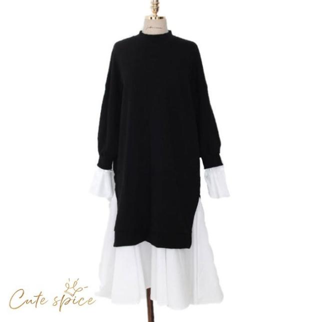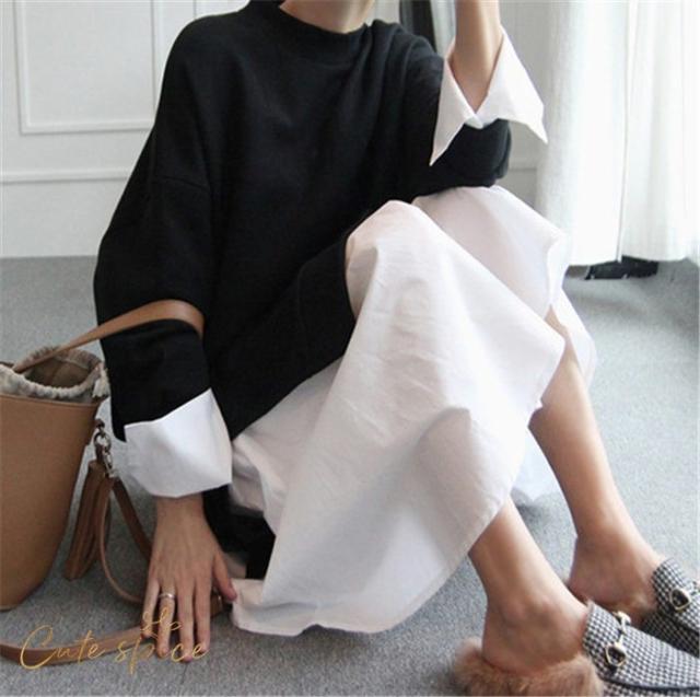 ロングワンピース フレアワンピース レディース 切り替え 長袖 シャツワンピース 体型カバー ロング丈 大きいサイズ ゆったり 着痩せ 秋 冬 フェイクレイヤード