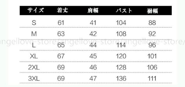 | サイズについての説明 | カラー:ワイン ネイビー ブラック グレーダークグリーン グリーン インディゴサイズ:S M L XL 2XL 3XL S 肩幅41 バスト104 着丈61 裾幅88 M: 肩幅42 バスト108 着丈63 裾幅92 L: 肩幅44 バスト114 着丈65 裾幅96 XL: 肩幅45 バスト120 着丈67 裾幅101 2XL: 肩幅46 バスト128 着丈69 裾幅106 3XL: 肩幅47 バスト136 着丈69 裾幅111(cm)●実寸はメジャー採寸の為、若干の誤差が生じる場合があります。●色合いはモニター環境により若干の誤差が出ます。 |