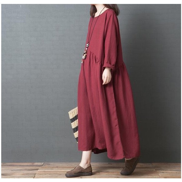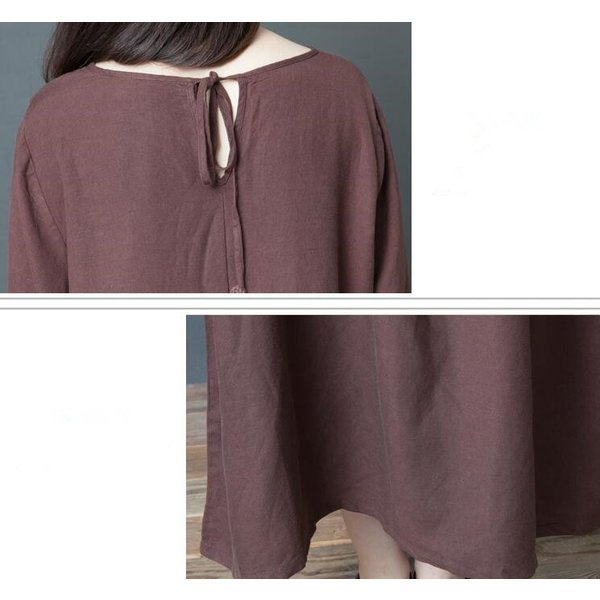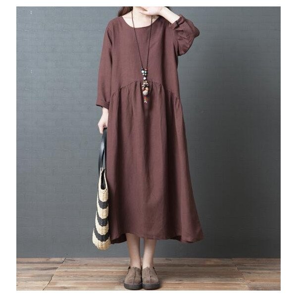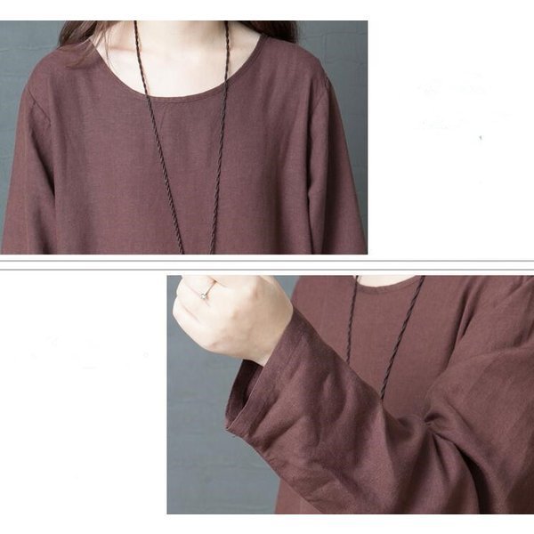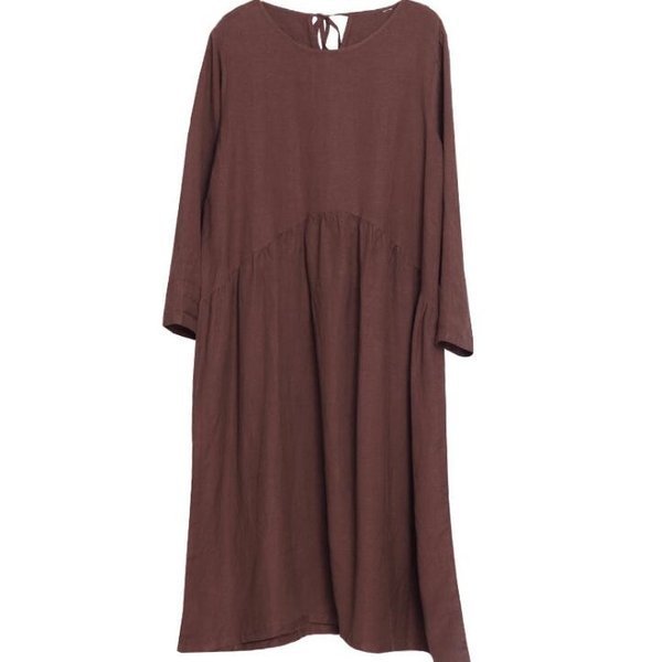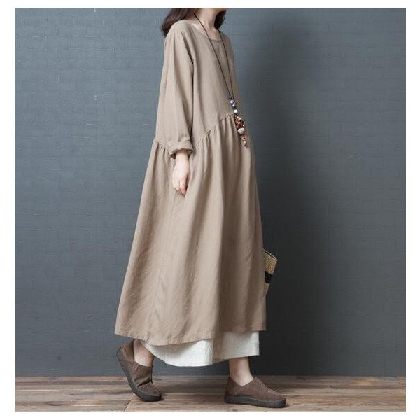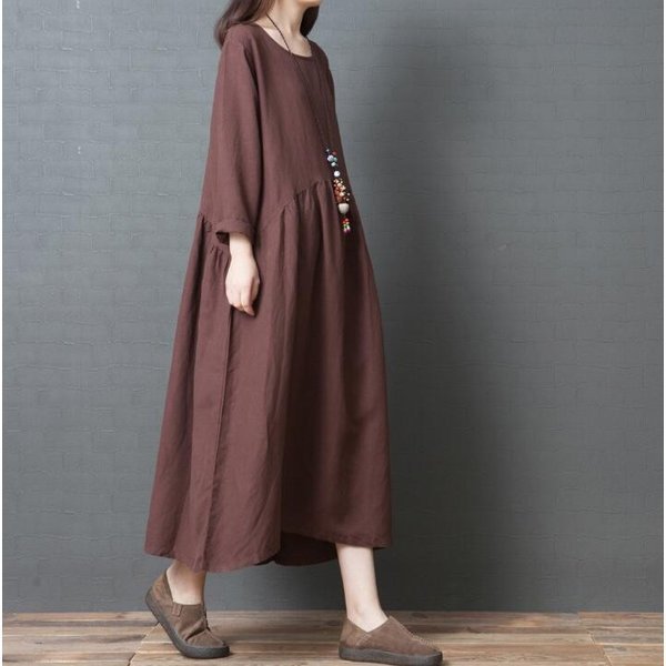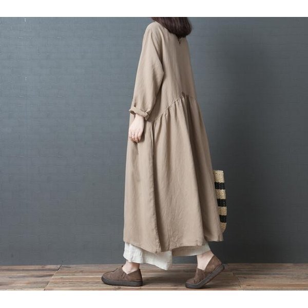 レディース ワンピース3色 リネン コットン シンプル ナチュラル ゆったりレトロ Aライン マキシワンピース 膝下 長袖 麻 体型カバー 春