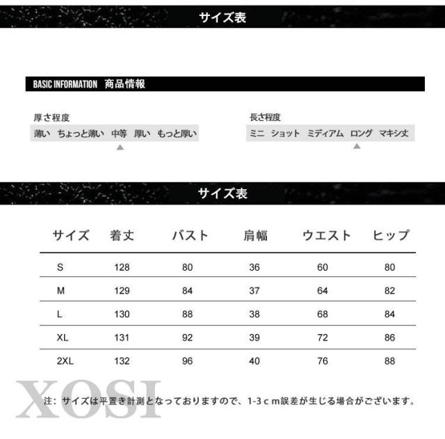| サイズについての説明 | [S]着丈128cm バスト80cm 肩幅36cm ウエスト60cm ヒップ80cm[M]着丈129cm バスト84cm 肩幅37cm ウエスト64cm ヒップ82cm[L]着丈130cm バスト88cm 肩幅38cm ウエスト68cm ヒップ84cm[XL]着丈130cm バスト92cm 肩幅39cm ウエスト72cm ヒップ86cm[XXL]着丈130cm バスト96cm 肩幅40cm ウエスト76cm ヒップ88cm |