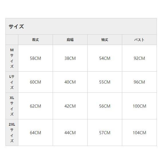 | サイズについての説明 | 【サイズ】Mサイズ 着丈58CM 肩幅38CM 袖丈54CM バスト92CM Lサイズ 着丈60CM 肩幅40CM 袖丈55CM バスト96CM XLサイズ 着丈62CM 肩幅42CM 袖丈56CM バスト100CM 2XLサイズ 着丈64CM 肩幅44CM 袖丈57CM バスト104CM 【カラー】ピンク、ホワイト、ブラック 【ご注意】:※上記表記は当店平置き実寸サイズになります。※大量生産による生産過程におきまして、若干の個体差が生じる場合がございます。※機械による生産過程におきまして、どうしても生地を織る際の糸の継ぎ目、多少のほつれや汚れなどが生じている場合がございます。※サイトに掲載されている商品は、モニター環境により実際のものと素材感・色が若干異なって見える場合がございます。 |