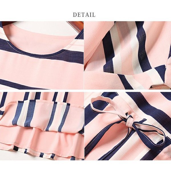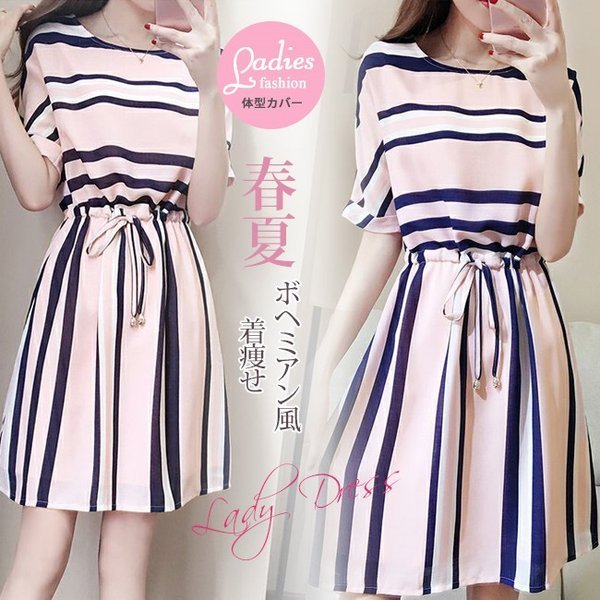 【セール】ワンピース レディース シフォン ボーダー ストライプ 切り替え リボン ウエストマーク aライン 半袖 ゆったり 大きいサイズ