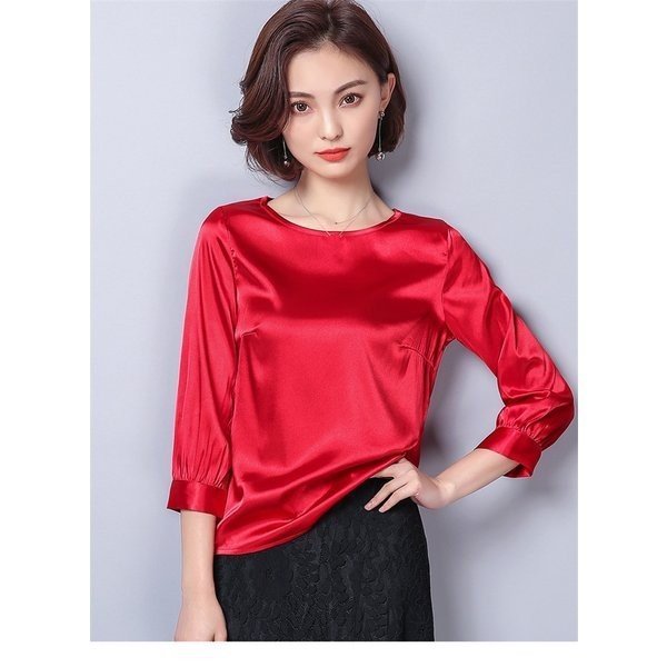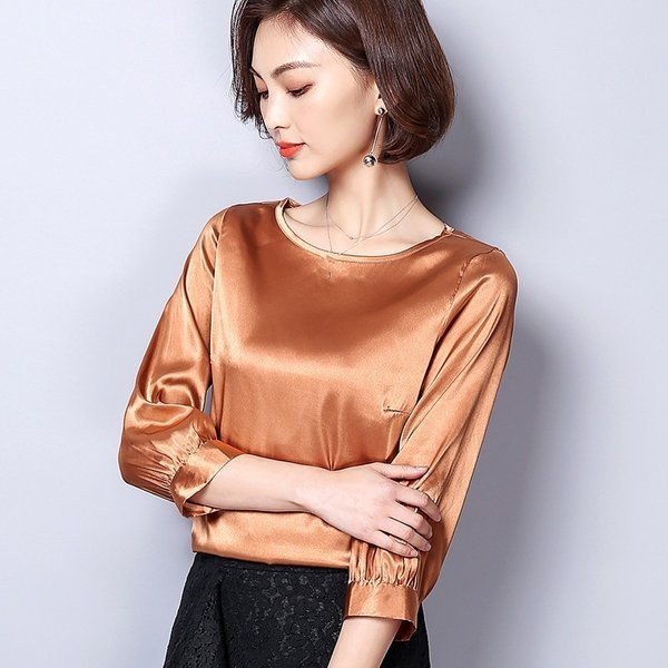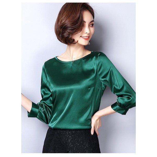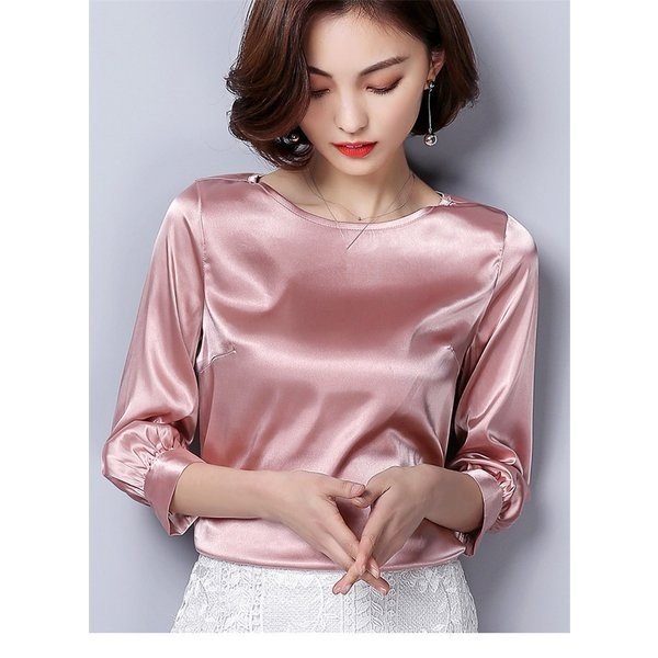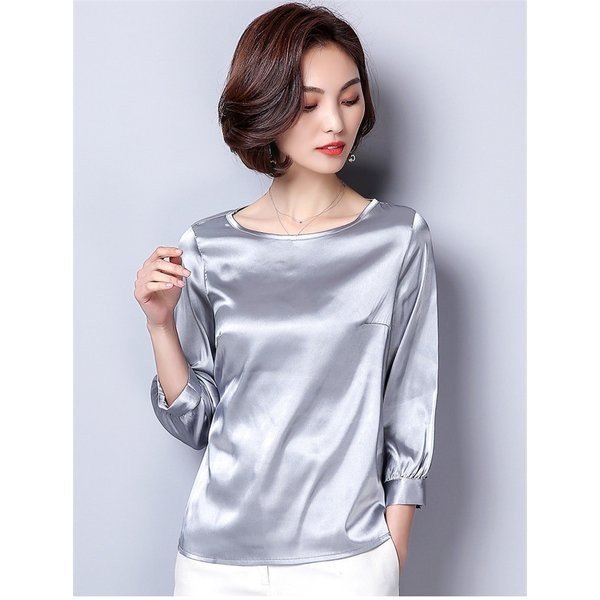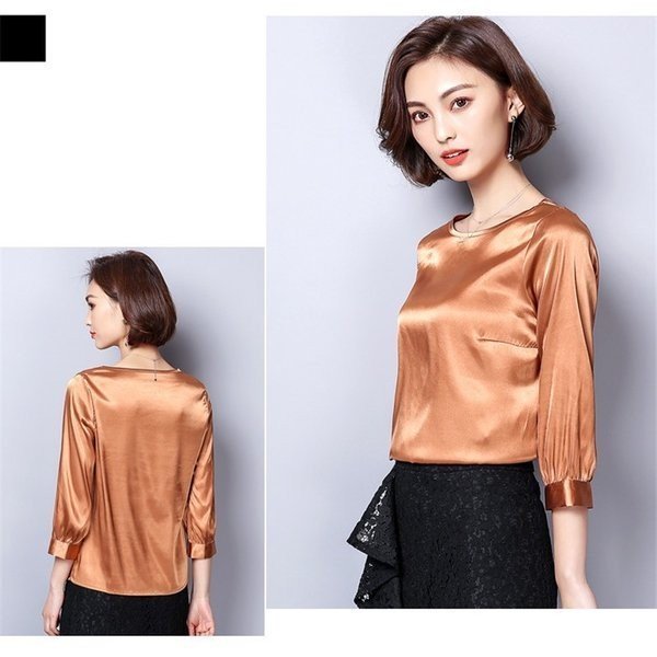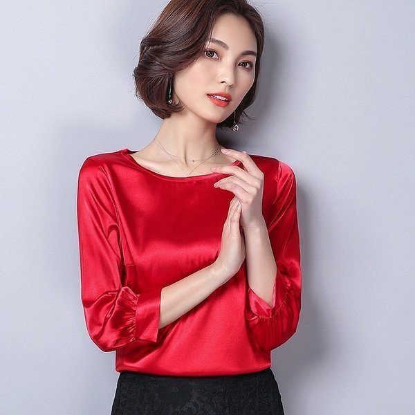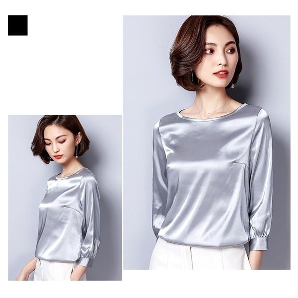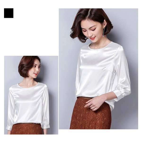 レディース サテンブラウス トップス シャツ ブラウス シャツカシュクール ラウンドネック 長袖 大きいサイズ 通勤 エレガン