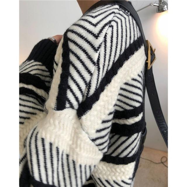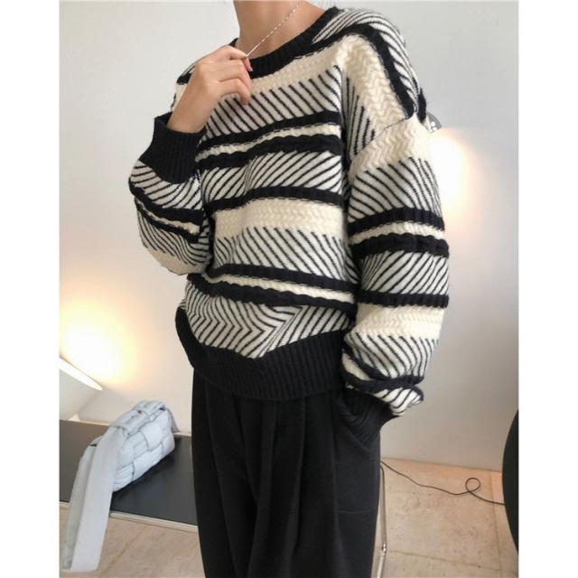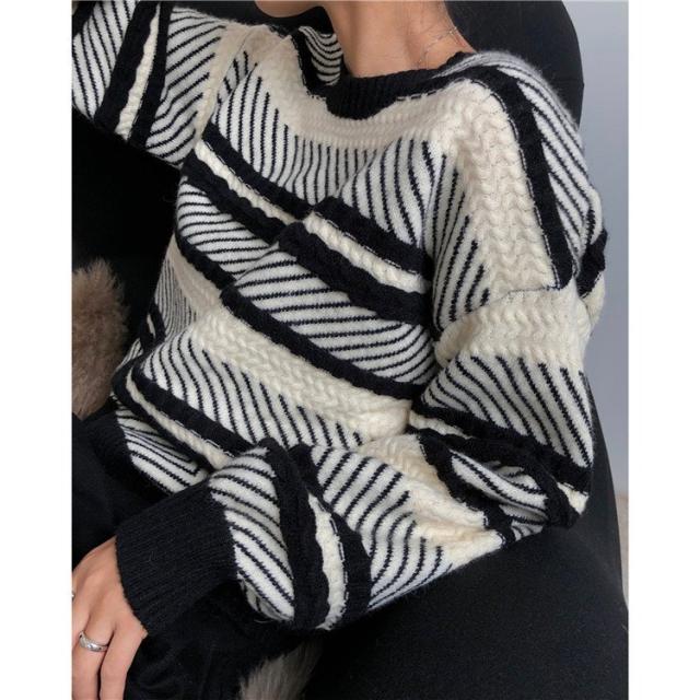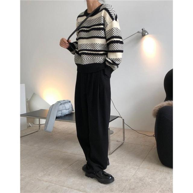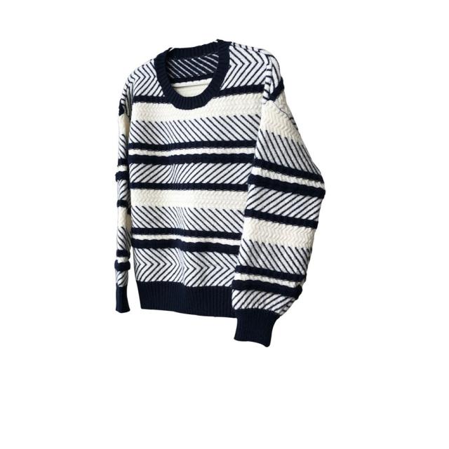 セーター レディース ニットセーター トップス プルオーバー レトロ ボーダー柄 バイカラー 丸首 長袖 フリーサイズ ゆったり カジュアル 重ね着