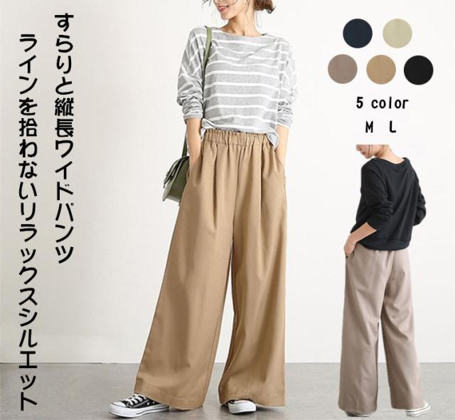 送料無料 ワイドパンツ レディース タックパンツ ガウチョ ゆったり 美ライン M L ネイビー ブラック ベージュ ブラウン グレージュ バギーパンツ
