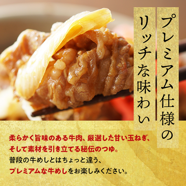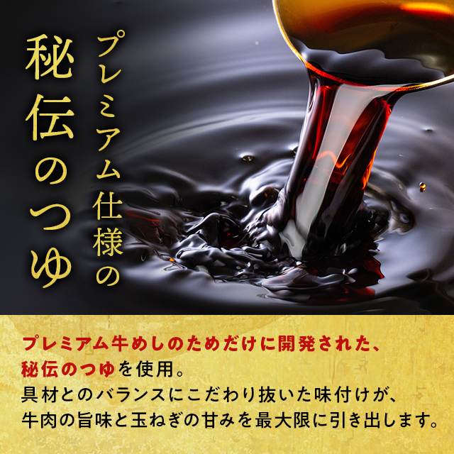 「牛めしの具(プレミアム仕様)」には、柔らかい肉質に、プレミアム牛めしのためだけに開発された秘伝のつゆと同じものを用いるとともに、甘くて柔らかい玉ねぎを使用しているのもおいしさの理由です。