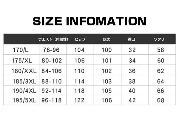 | サイズについての説明 | L: パンツ総丈100 ウエスト (伸縮性)XL: パンツ総丈101 ウエスト (伸縮性)2XL:パンツ総丈102 ウエスト(伸縮性)3XL:パンツ総丈103 ウエスト(伸縮性)4XL:パンツ総丈104 ウエスト(伸縮性) |