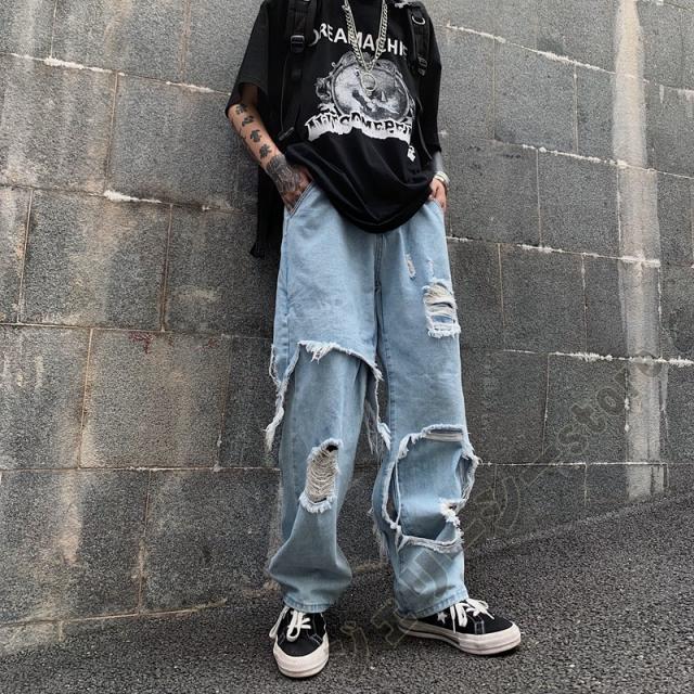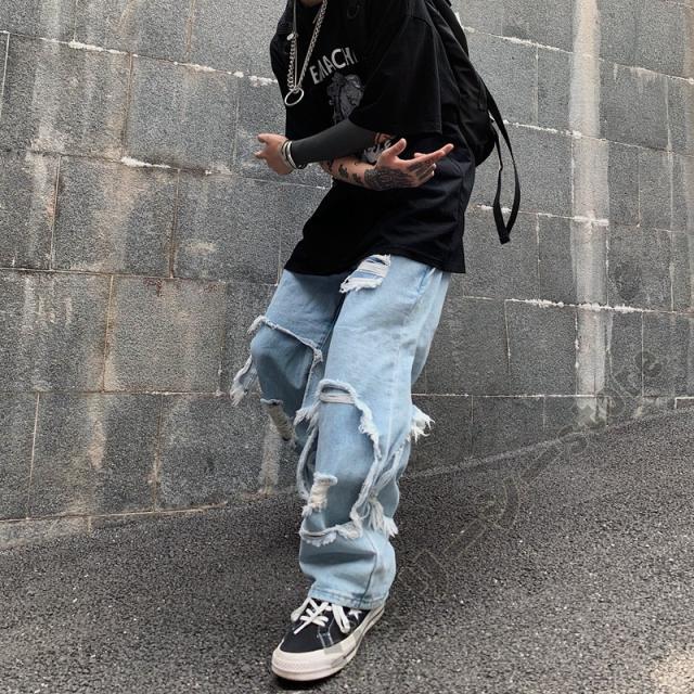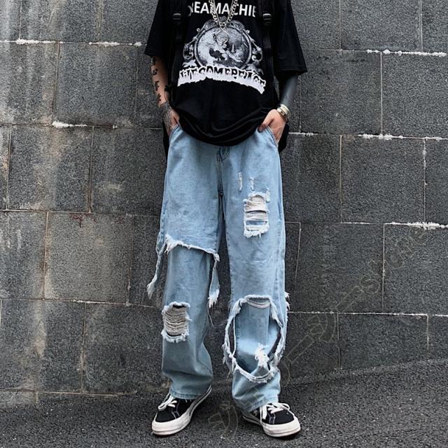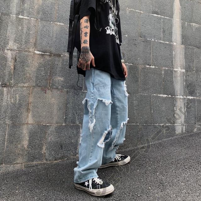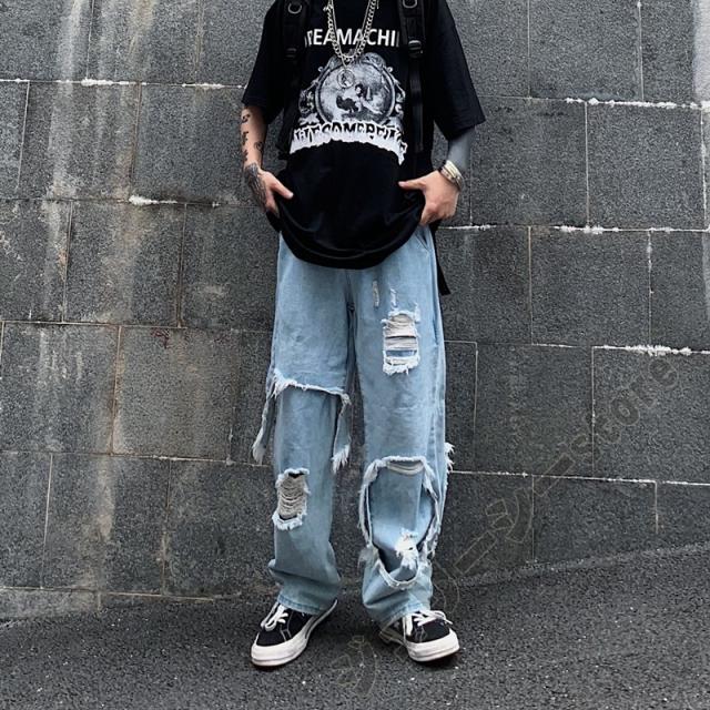 ロングパンツ デニムパンツ デニム ダメージ加工 ブラック ブルー ダンスボトムス ダンス衣装 運動着 舞台服 ストレート