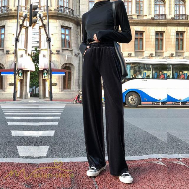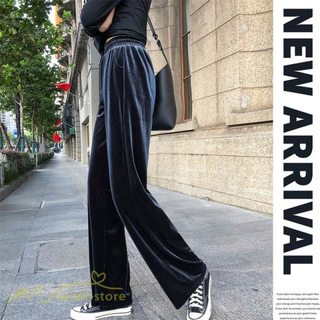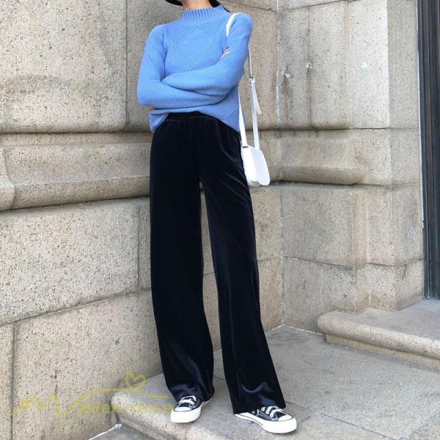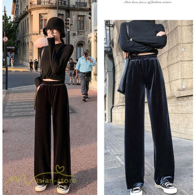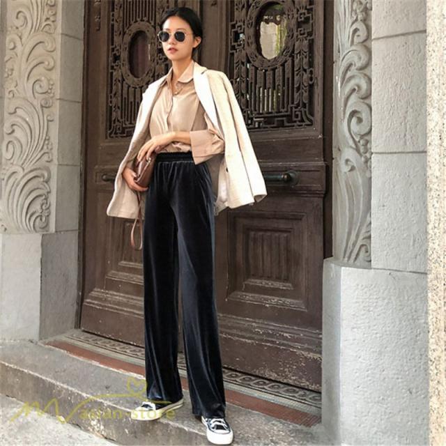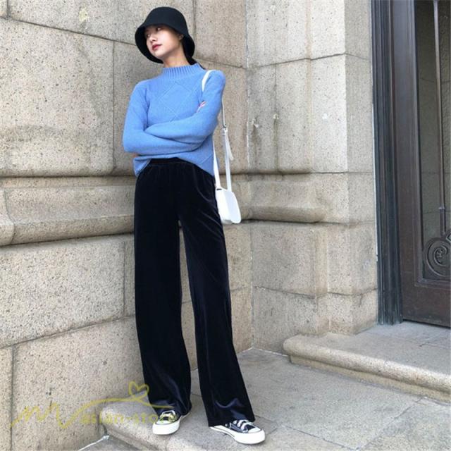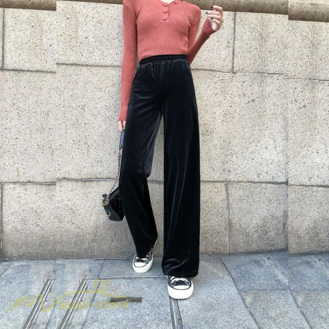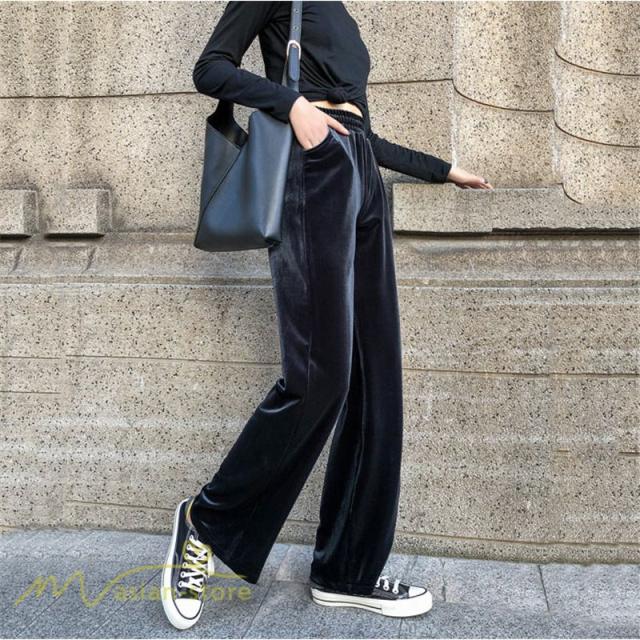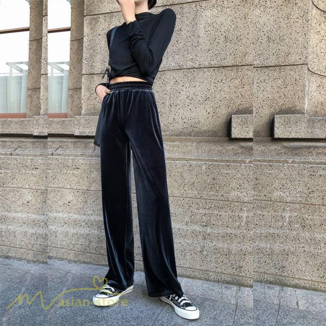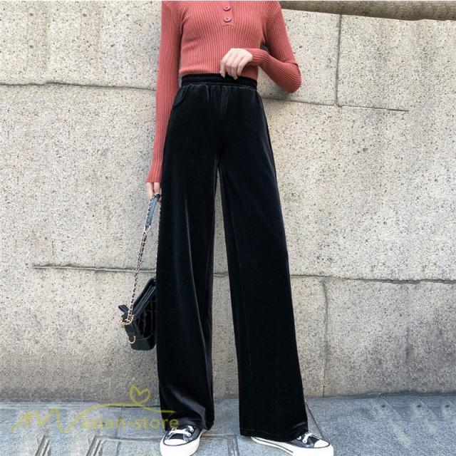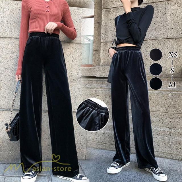 ワイドパンツ マキシ丈パンツ ストレートパンツ デイリーコーデ ベルベット 着痩せ 美脚効果アリ 2020新制作 冬コーデ ハイウエスト ウエストゴム オシャレ