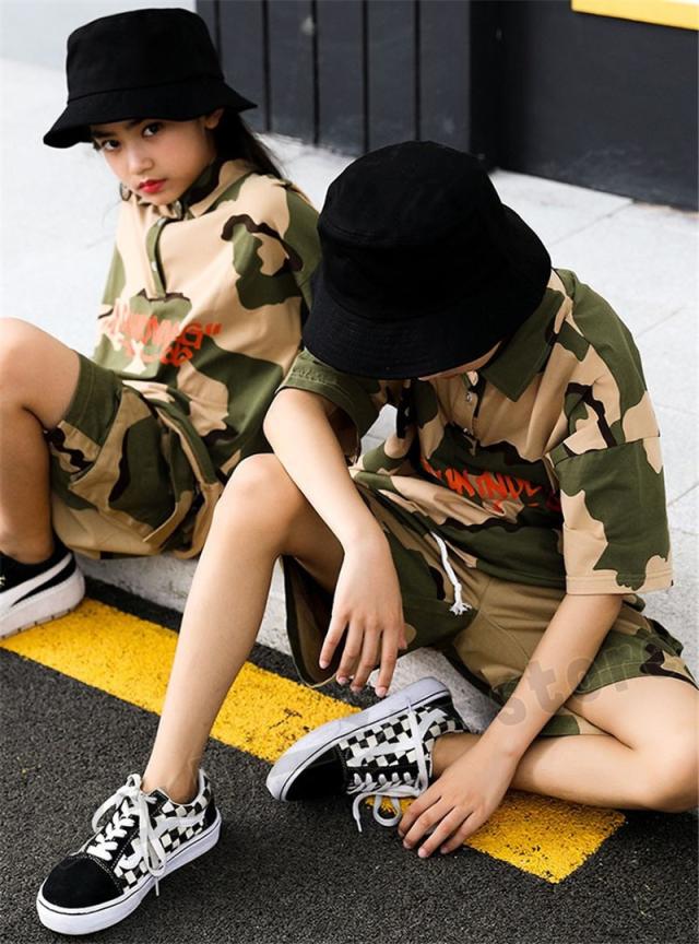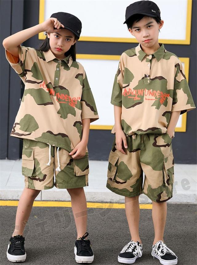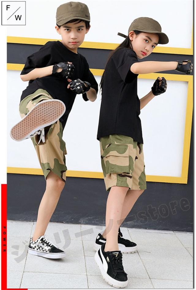 迷彩柄キッズダンス衣装 カーゴパンツ キッズ カラフル 迷彩パンツ セットアップ Tシャツ 半袖 ミリタリーパンツ シャツ ズボン 軍パン ヒップホップ