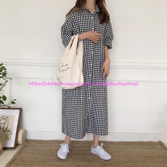 シャツワンピース 羽織 レディース シャツ チュニック マキシワンピース チェック柄 ロングシャツ シルエット Aライン 体型カバー 半袖 前開き 春夏 黒白 Free