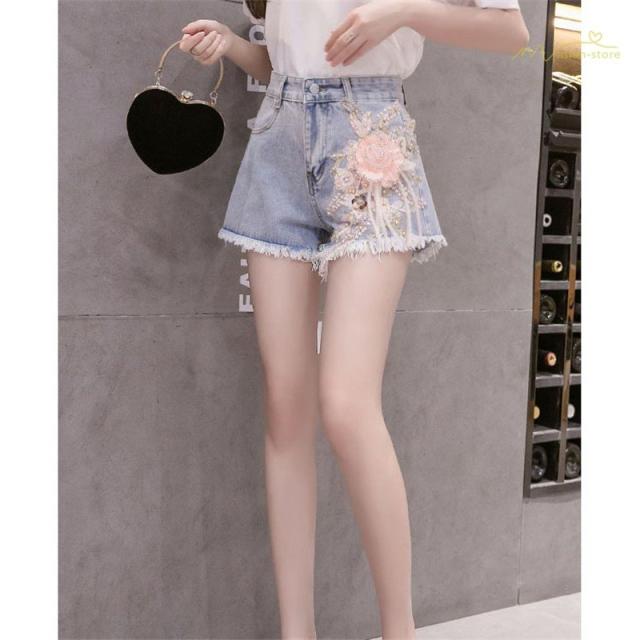 デニムパンツ ショートパンツ ダメージ加工 フリンジ 立体花柄 無地 夏物 デイリーコーデ ボトムス ジーンズ ジーパン ハイウエスト スタイリッシュ 人気