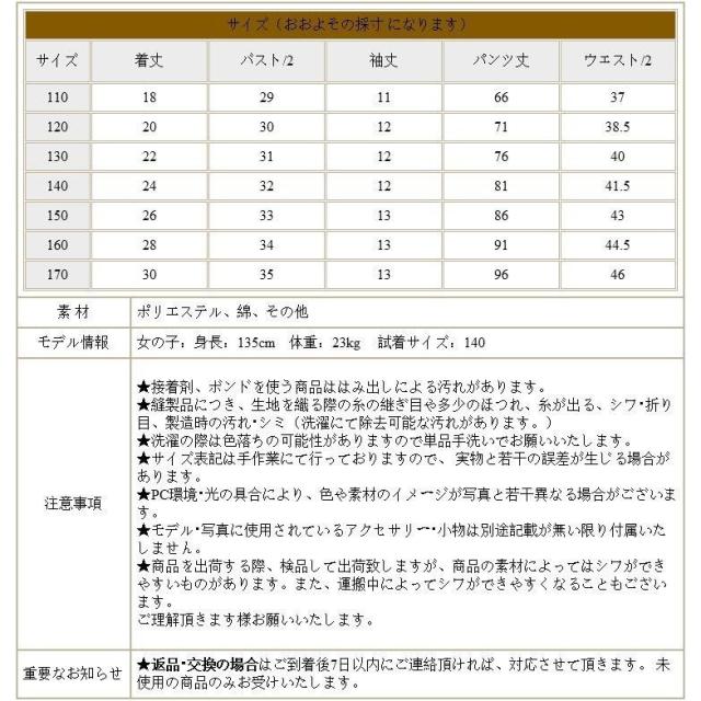 | サイズについての説明 | 参考サイズ(単位:cm)110/120/130/140/150/160/170モデル情報:身長:135cm 体重:23kg 試着サイズ:140 ★PC環境 光の具合により色 質感のイメージが画像と若干異なる場合がございますので予めご了承くださいませ。 |