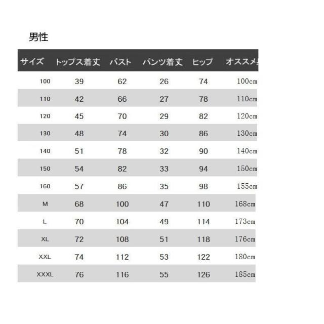| サイズについての説明 | サイズ:(単位:cm)子供:90/100/110/120/130/140/150/160ママ:S/M/L/XL/XXL/3XLババ:M/L/XL/XXL/XXXL/4XL |
