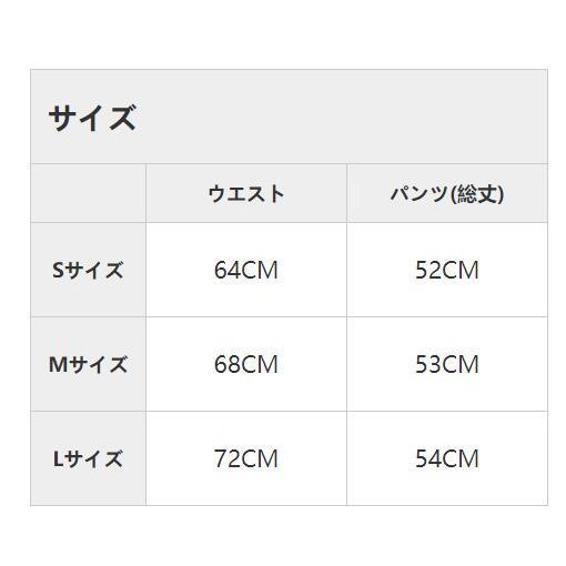 | サイズについての説明 | 【サイズ】Sサイズ ウエスト64CM パンツ(総丈)52CM Mサイズ ウエスト68CM パンツ(総丈)53CM Lサイズ ウエスト72CM パンツ(総丈)54CM |