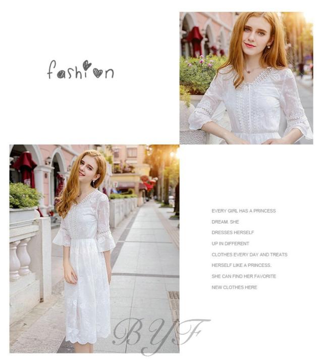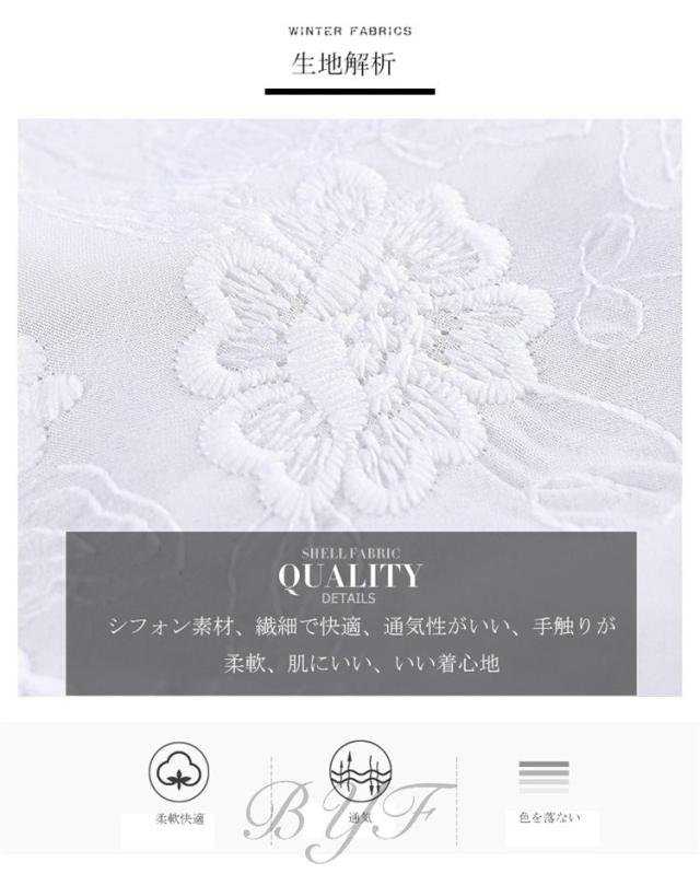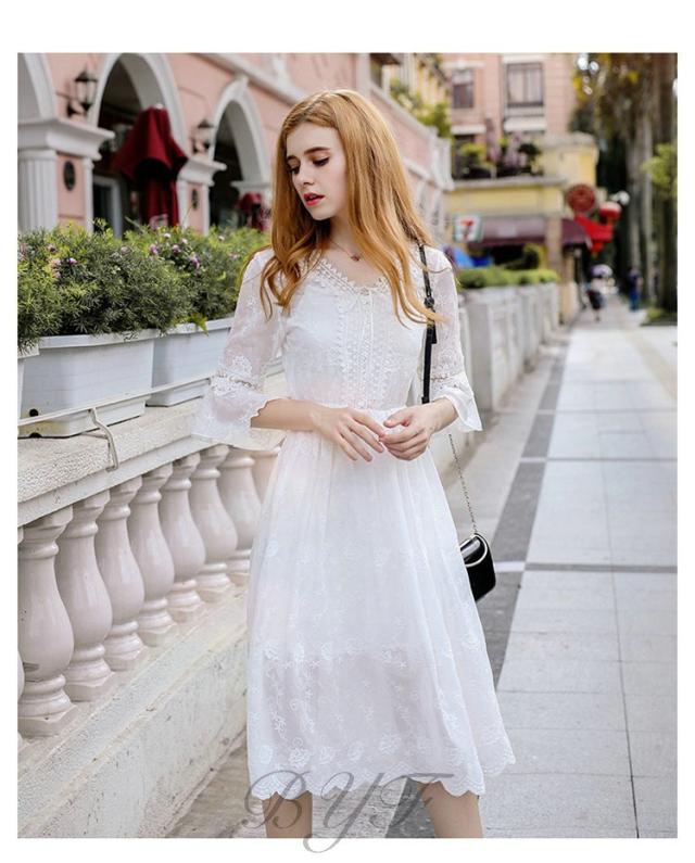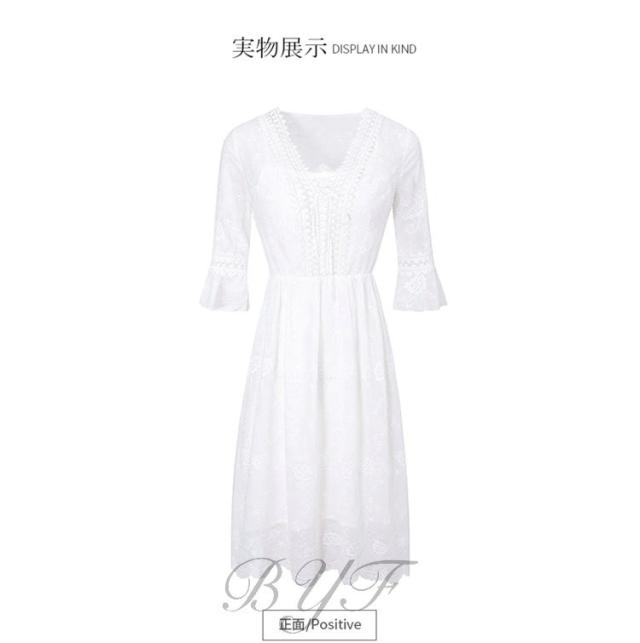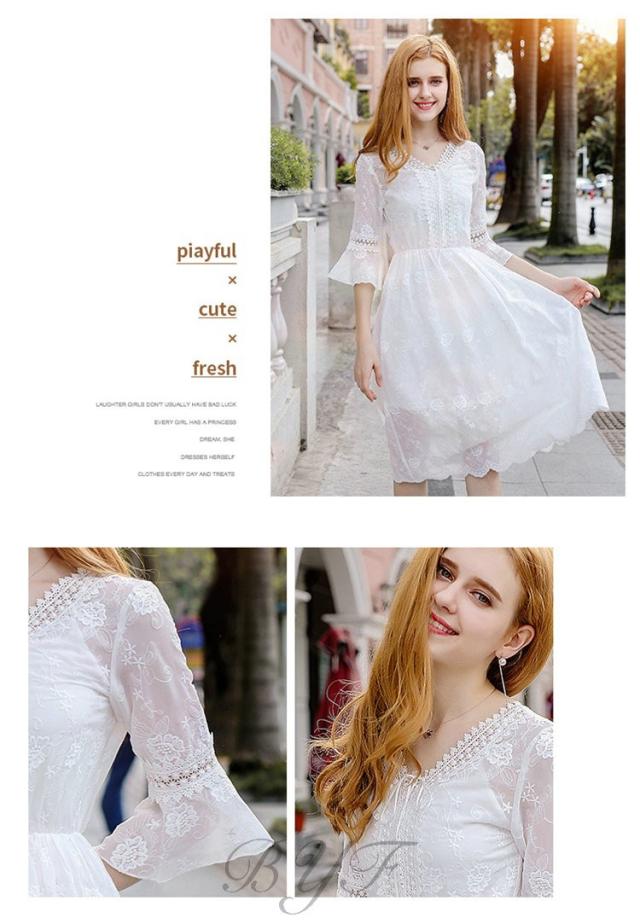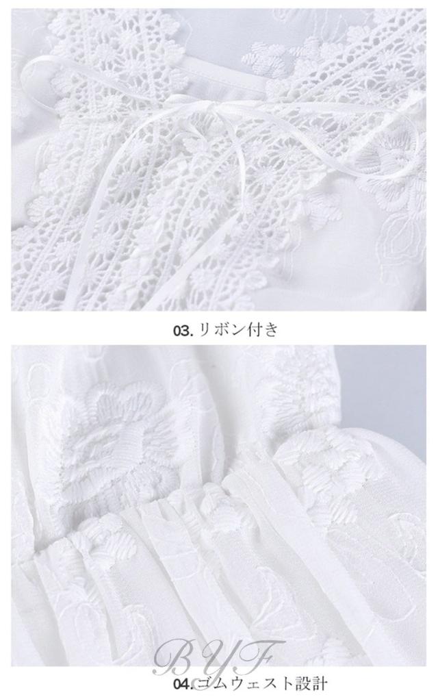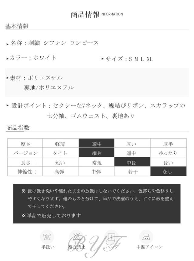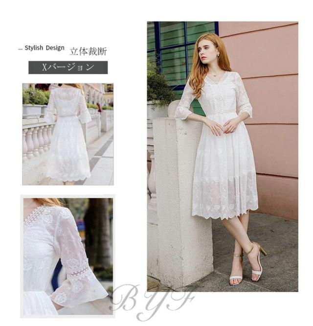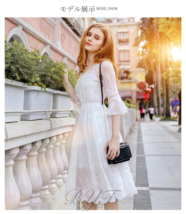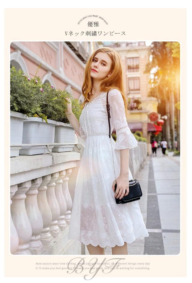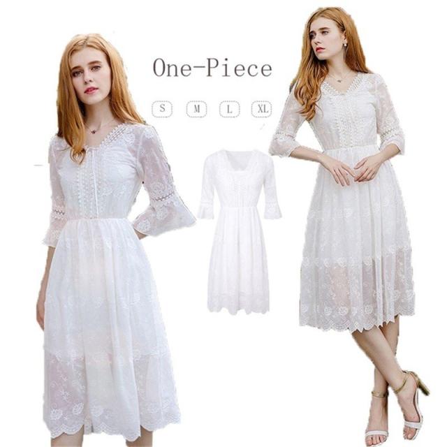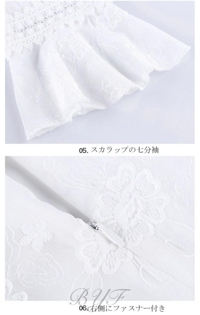 シフォンワンピース Vネック Aライン 膝丈ワンピース 刺繍 ワンピース レディース スカラップ袖 ミモレ丈ワンピース ウエストゴム ドレス ホワイト 旅行 演奏会