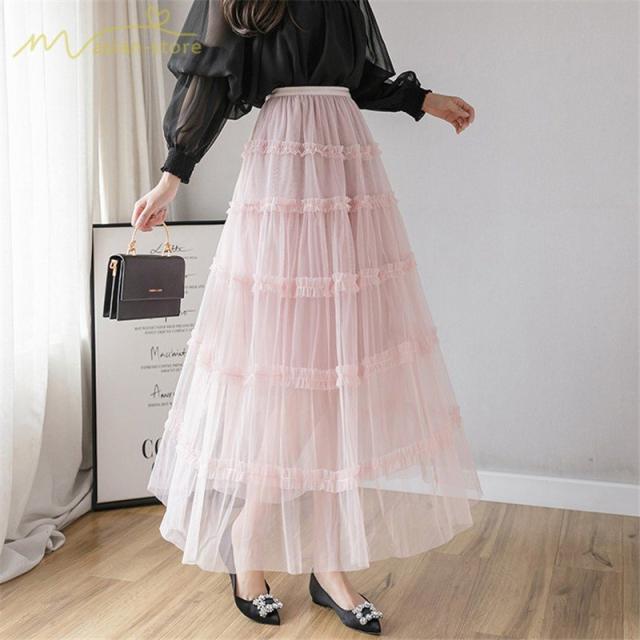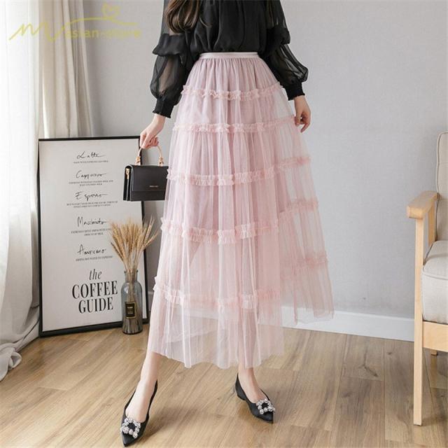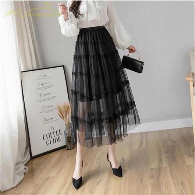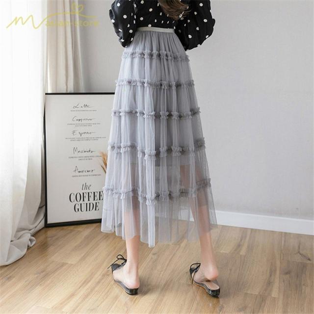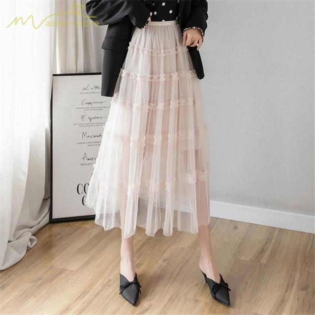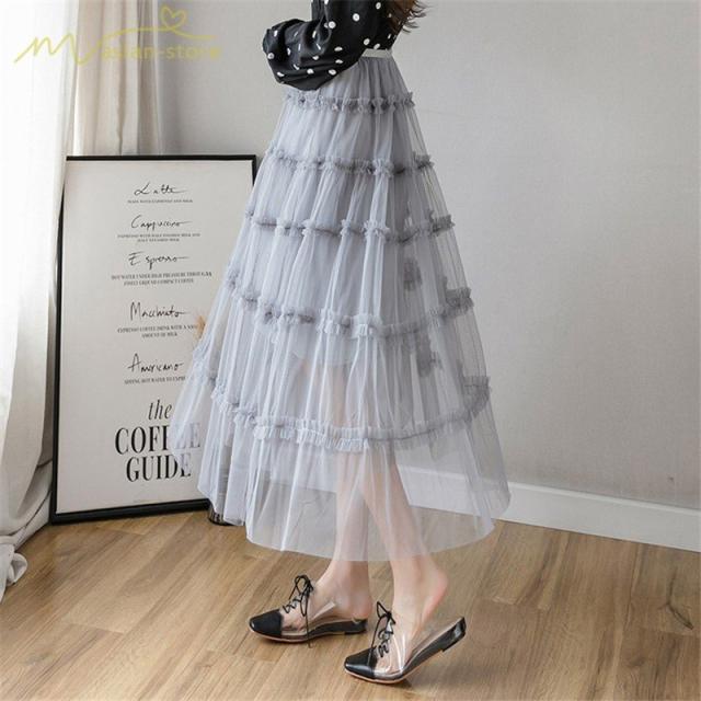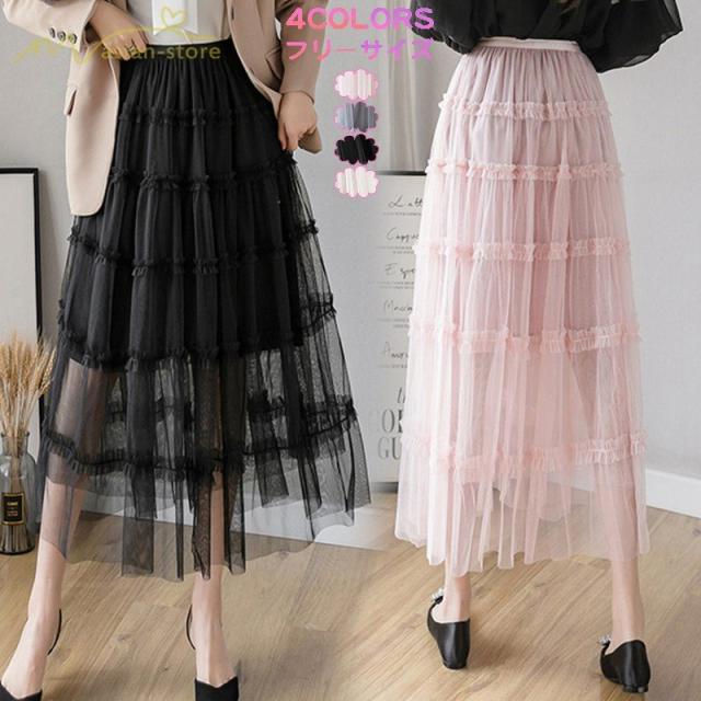スカート パウスカート Aライン ギャザー プリーツフレア チュール 透け感 裏地付き フリーサイズ 2020新制作 夏コーデ デイリーコーデ シフォン