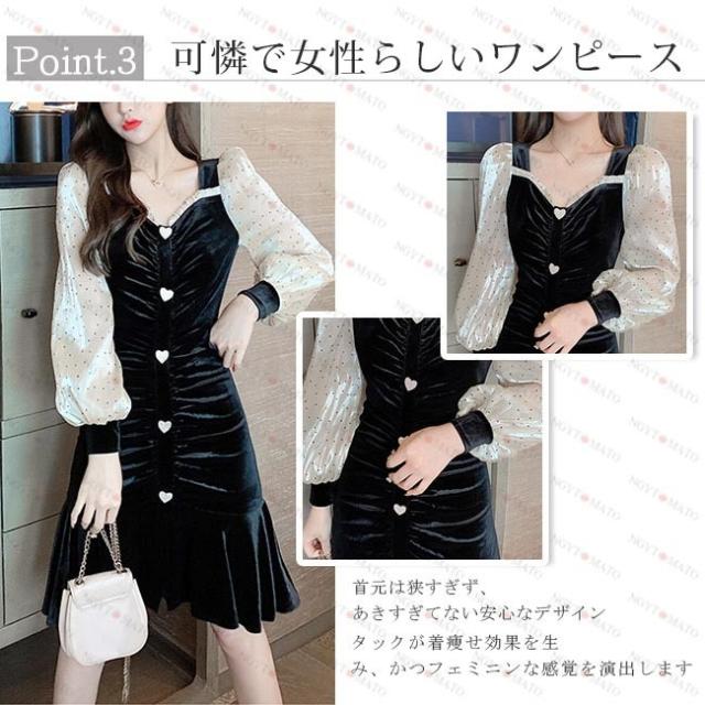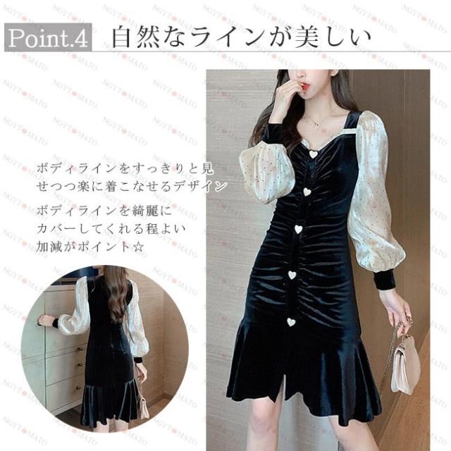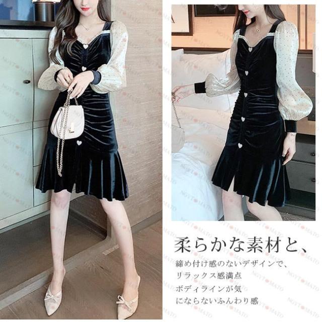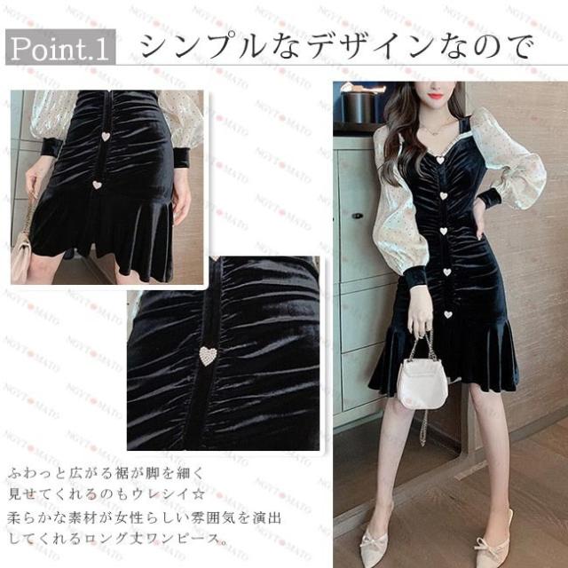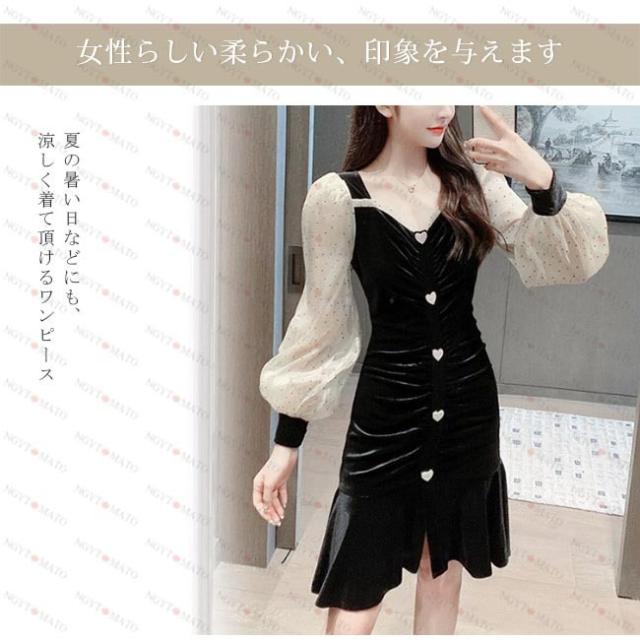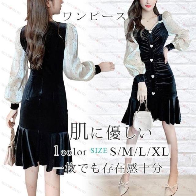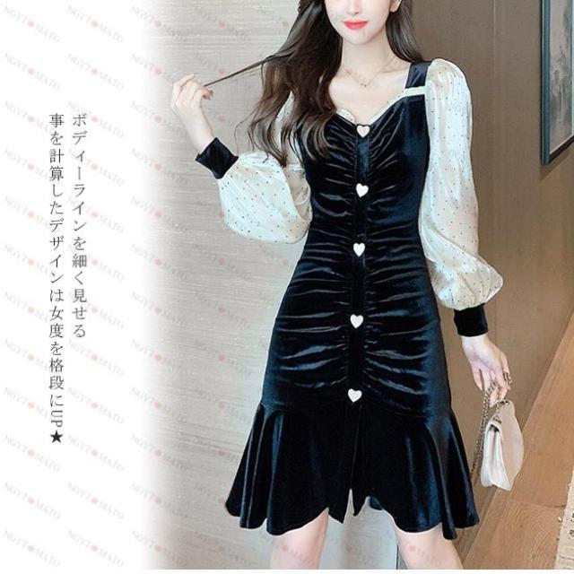 ワンピース レディース プリーツ ベルベット調 マーメイドライン ランダムプリーツ ショート丈 水玉 ブラック セックス シースルーのデザイン 透け感
