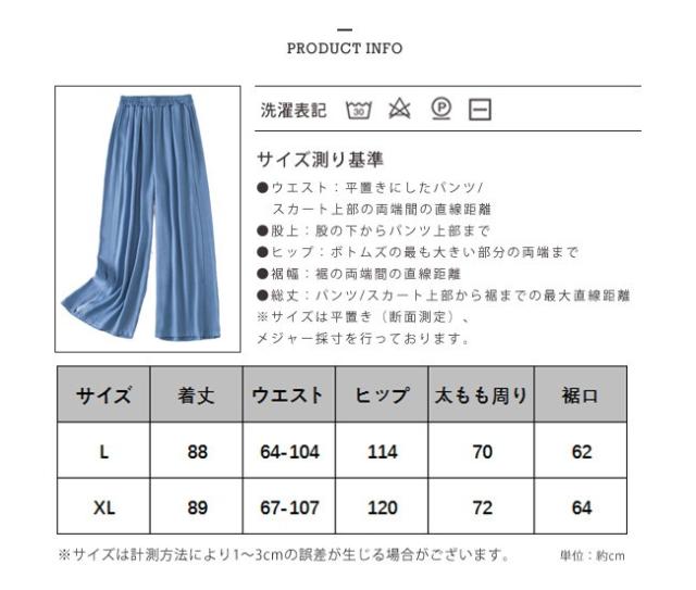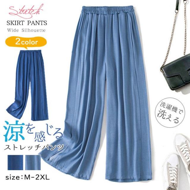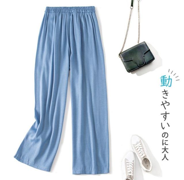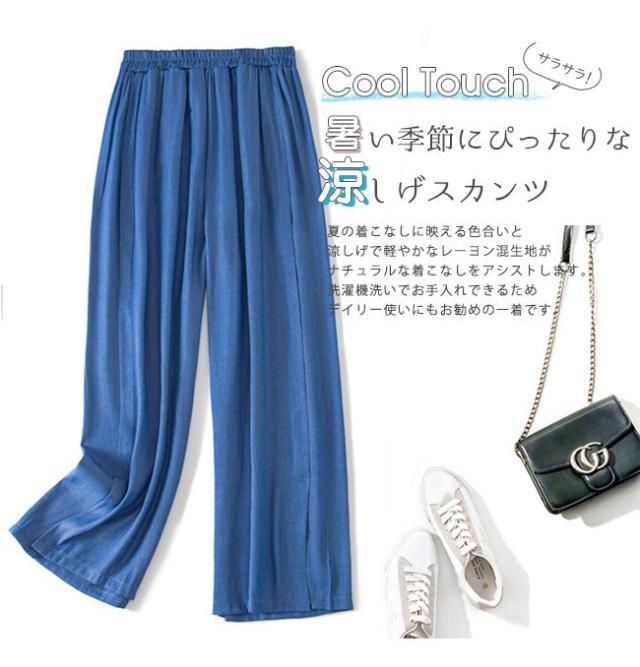 ガウチョパンツ デニム調 薄手 スリット入り ロング ハイウエスト タック入り ウエストゴム 夏秋 秋 レディース
