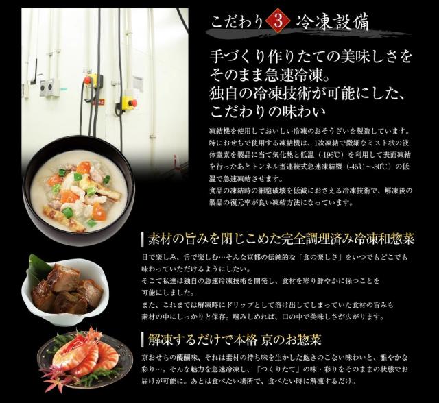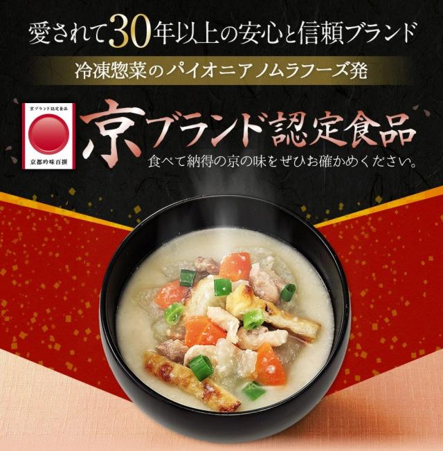 京都伏見の老舗酒蔵「黄桜」の酒粕を使用した粕汁です。京赤地どりや大根・人参・京揚げをたっぷり入れて具たくさんに仕上げました。湯せん解凍していただくだけでお手軽に京都のほんまもんの粕汁が味わえます。加熱調理から急速冷凍、製品完成後まで厳密な温度管理と細菌検査を実施。厳しい工程をクリアした製品のみが出荷されます。