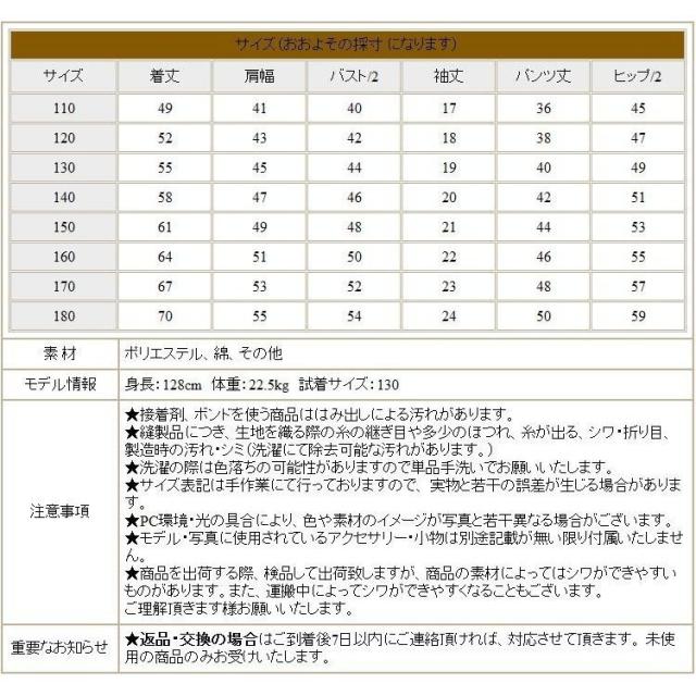 | サイズについての説明 | 参考サイズ(単位:cm)110/120/130/140/150/160/170110:お勧め身長:100cm-110cm120:お勧め身長:111cm-120cm130:お勧め身長:121cm-130cm140:お勧め身長:131cm-140cm150:お勧め身長:141cm-150cm160:お勧め身長:151cm-160cm170:お勧め身長:161cm-170cm 180:お勧め身長:171cm-180cm モデル情報:身長:128cm 体重:22.5kg 試着サイズ:130 ★PC環境 光の具合により色 質感のイメージが画像と若干異なる場合がございますので予めご了承くださいませ。 |