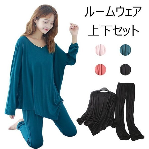 レディース 2点セット ルームウェア ビッグTシャツ ロングパンツ 上下セット ゆったり 無地 長袖 セットアップ 部屋着 寝間着