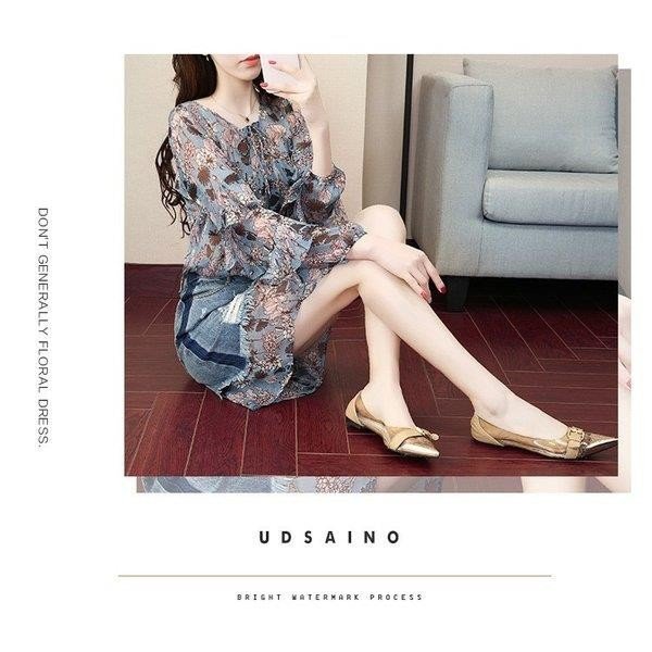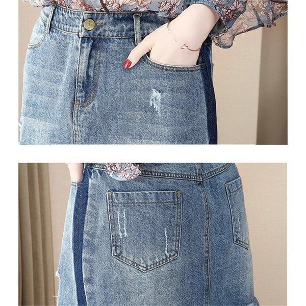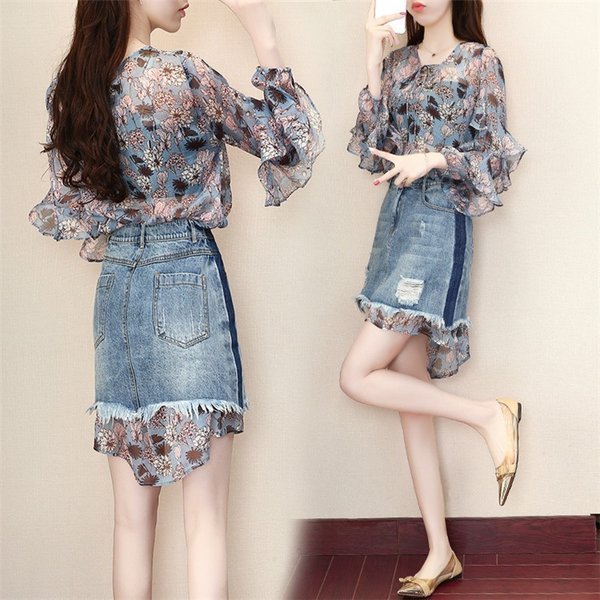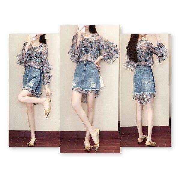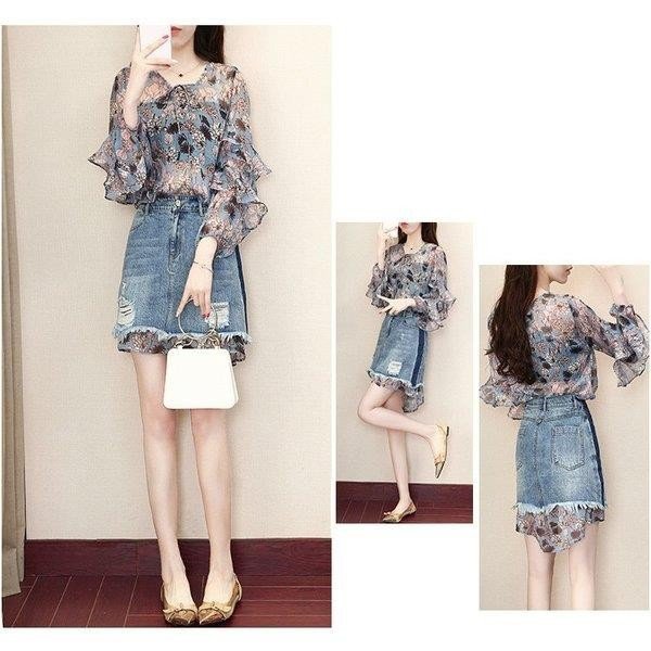 スーツセットアップ レディース 春秋 シフォン シャツ 花柄 七分袖 2点セットアップ 大きいサイズ ショート丈 デニムスカー