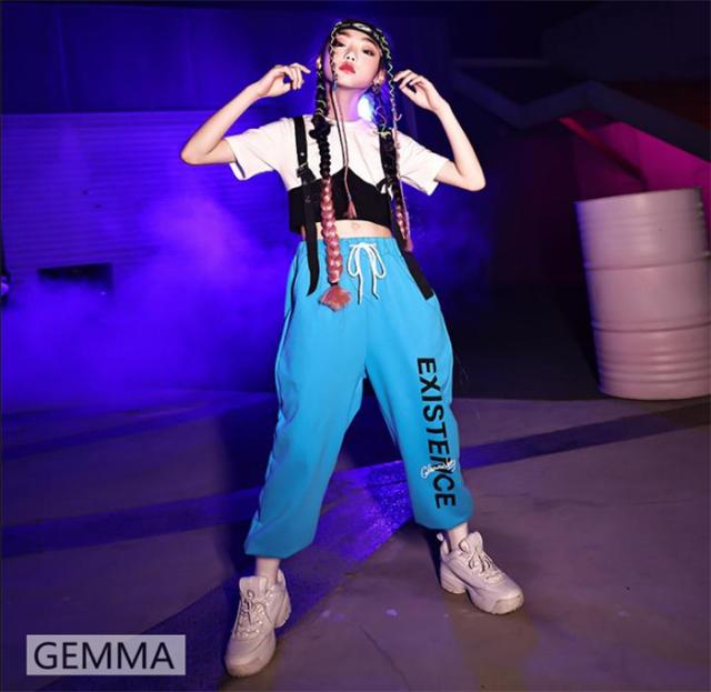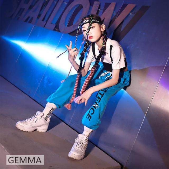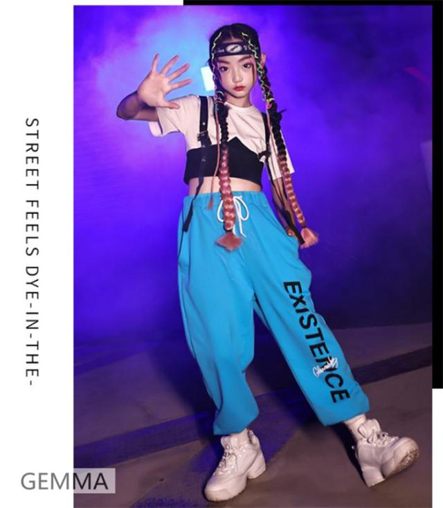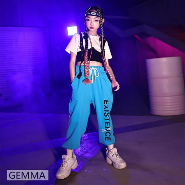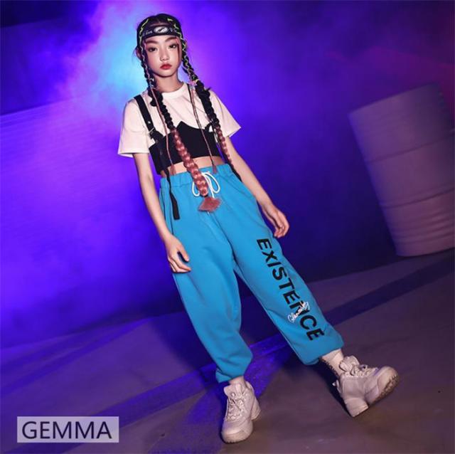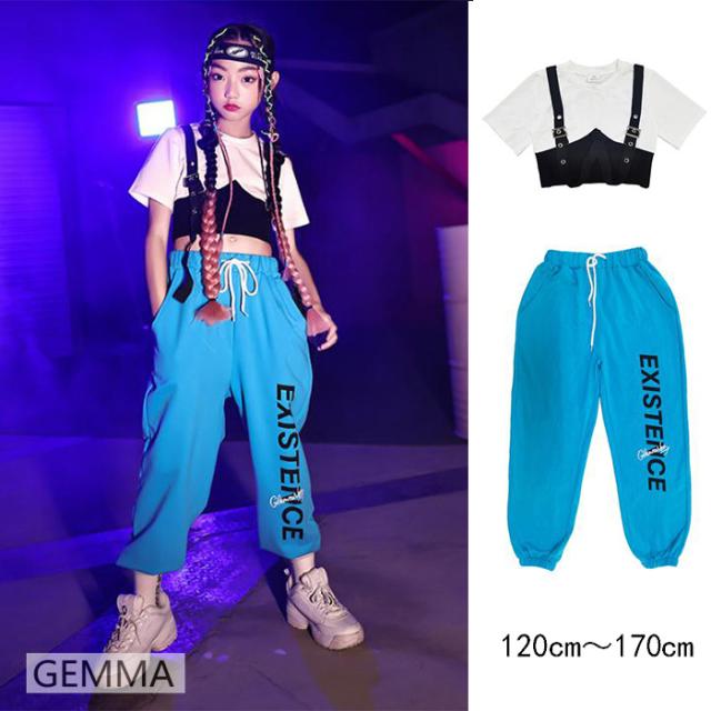 キッズダンス衣装 女の子 ブルー ロングパンツ ホワイトtシャツ ヒップホップ 練習着 ジャズ urban hiphop イベント 子供ダンス衣装