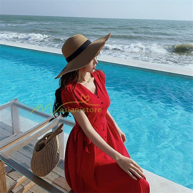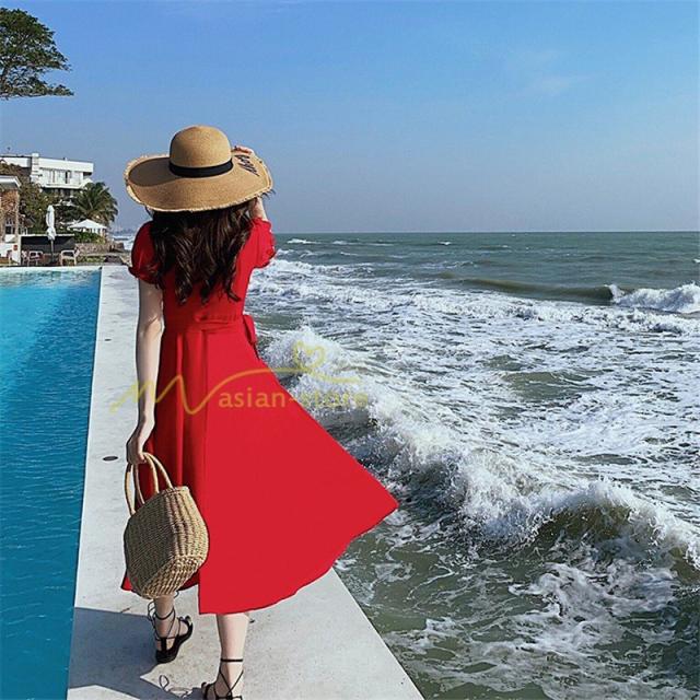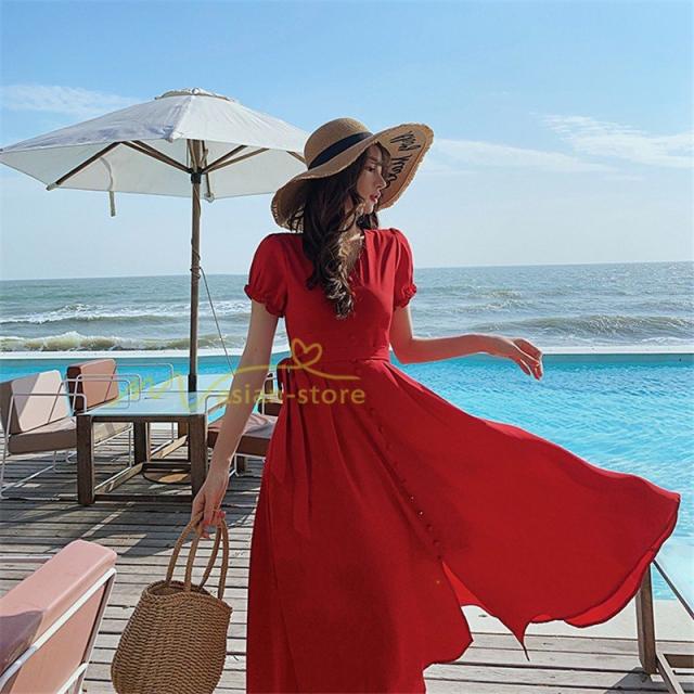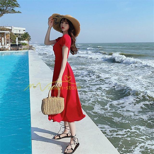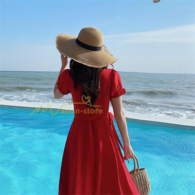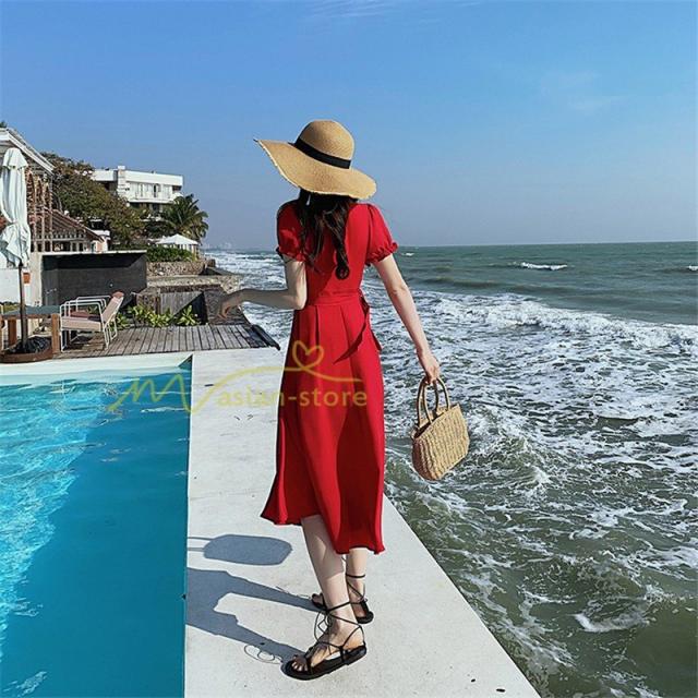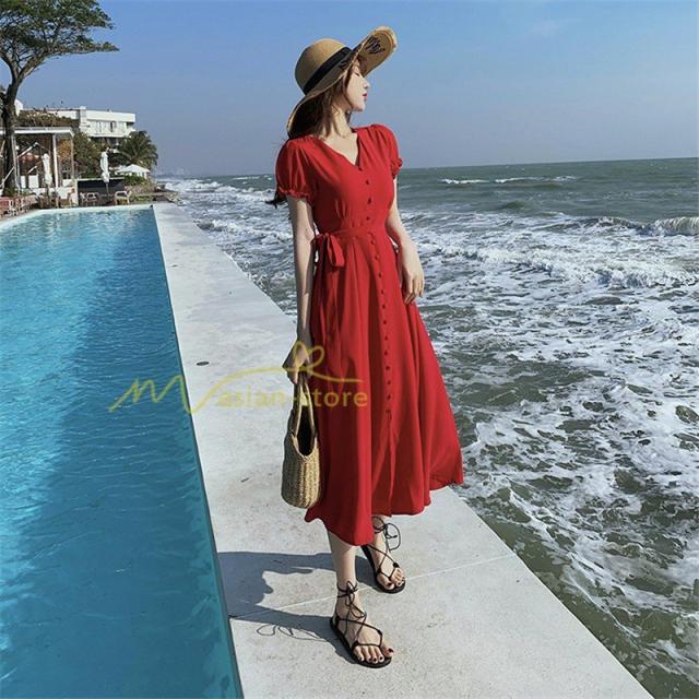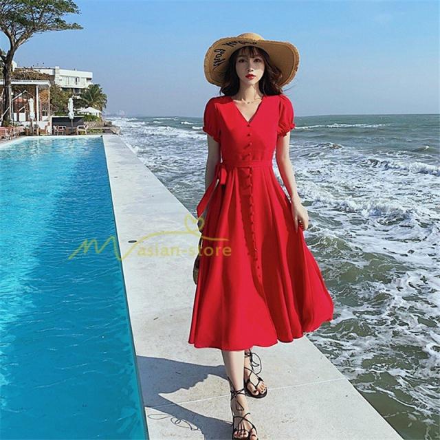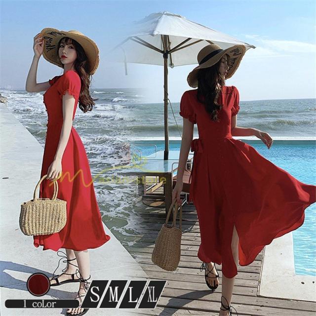 ワンピース リゾートワンピ 半袖 ビーチワンピ 旅行 プリーツフレア 無地 夏物 旅行 マキシ丈 Vネック ハイウエスト ボタン付き 復古風 リボン付き