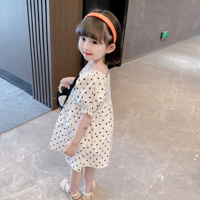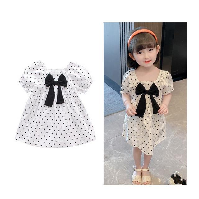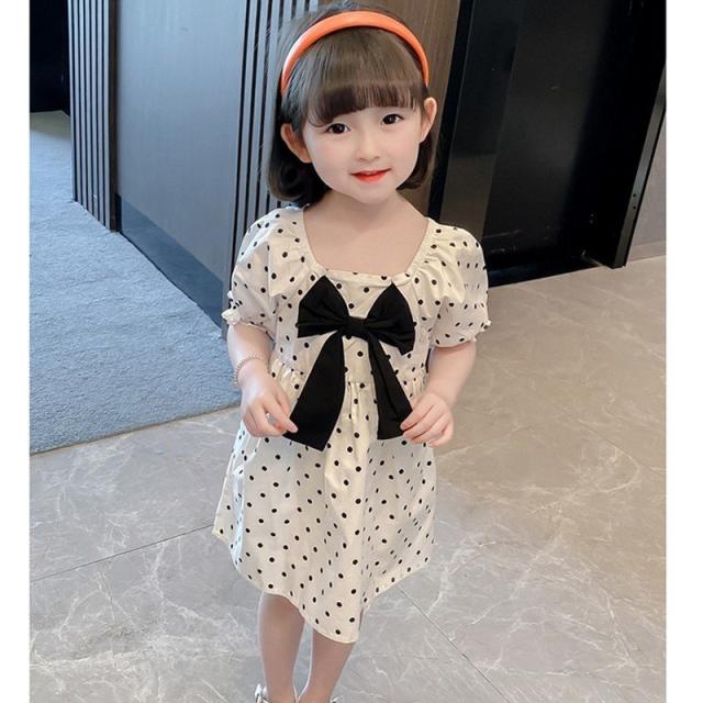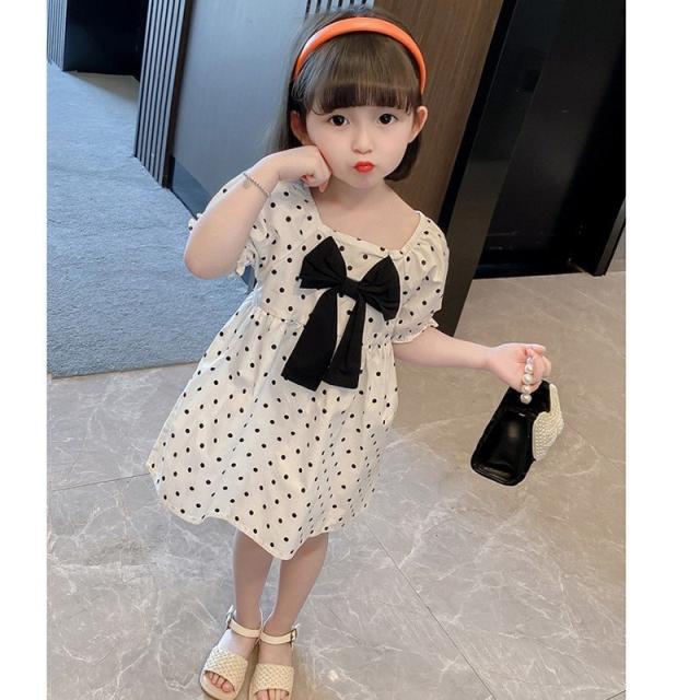 ワンピース 子供服 キッズ 女の子 カジュアルドレス 半袖 スクエアネック リボン パフスリーブ 袖口ゴム ドット柄 水玉 ギャザー 膝丈 かわいい