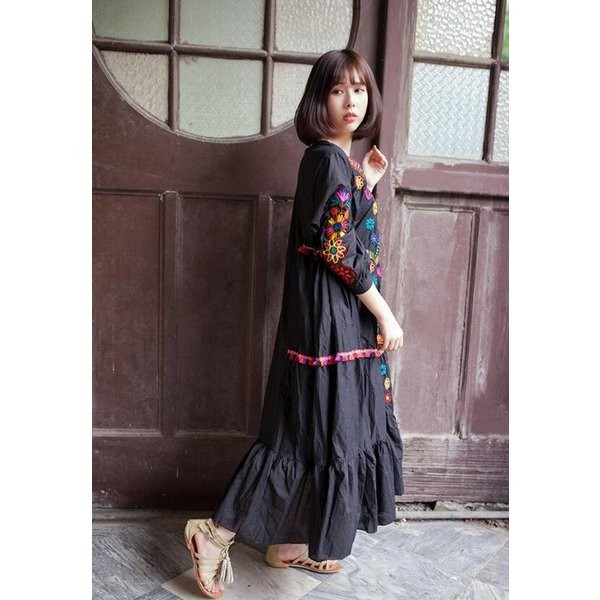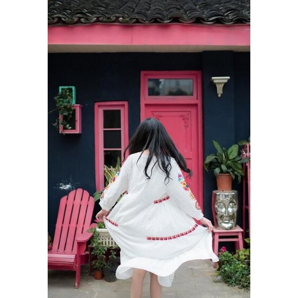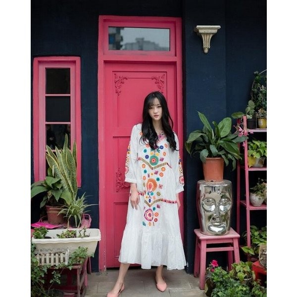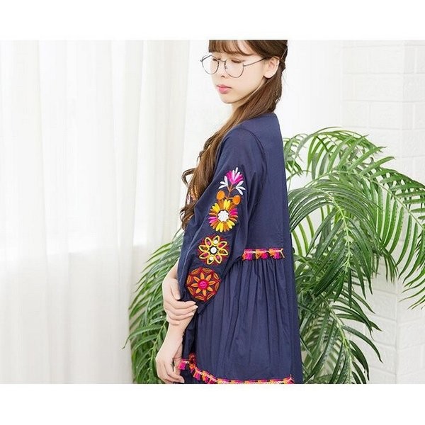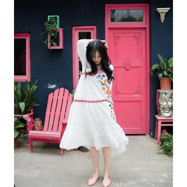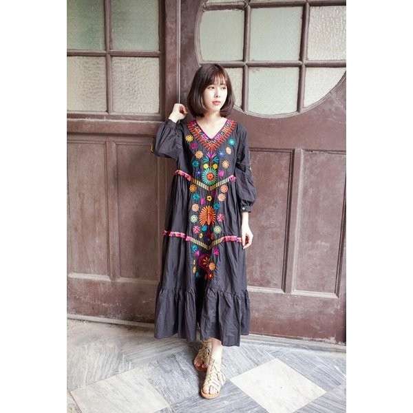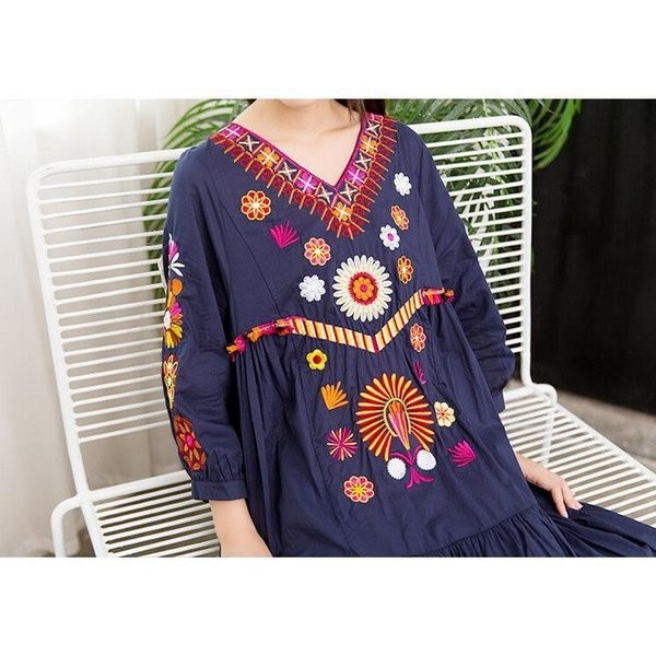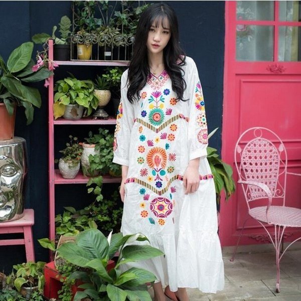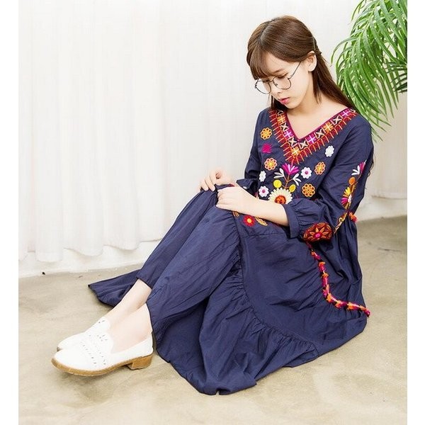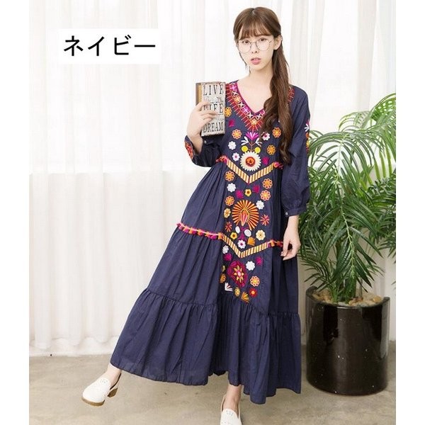 ボヘミアン風 ワンピース レディース タンクワンピース ロングワンピース 長袖 Vネック ロング丈 リゾート 刺繍 花柄 ホワイト ネイビー ブラック