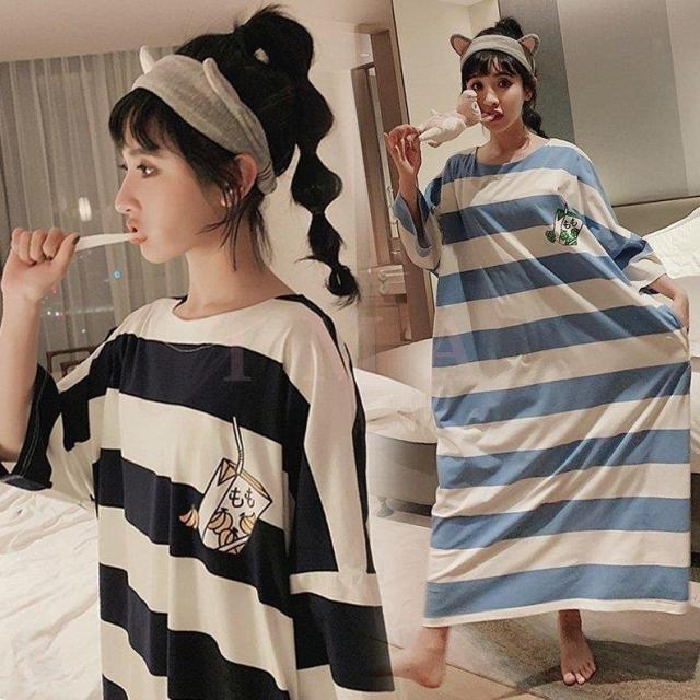 ネグリジェ レディース 春夏パジャマ 半袖ワンピース ロングネグリジェ ボーダー柄 パジャマ可愛い ルームウェア 部屋着 ネグリジェ ゆったり マタニティー