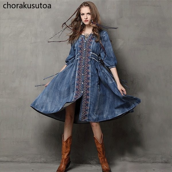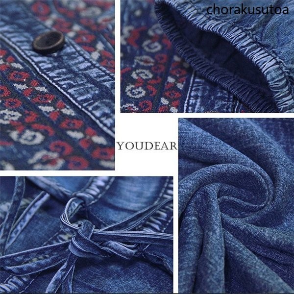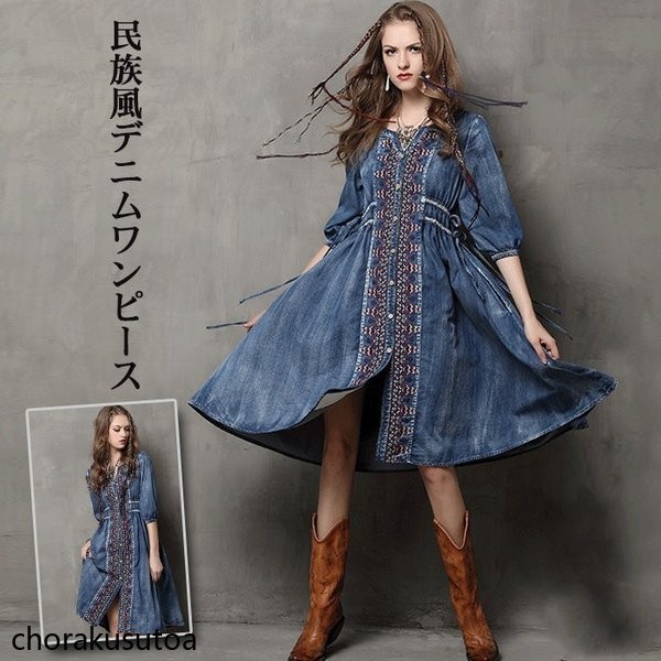 ワンピース レディース デニムワンピース ミディアム丈 半袖 デニムワンピ 膝丈 ワンピース 刺繍柄 民族風 カジュアル おしゃれ 着痩せ デニムワンピース