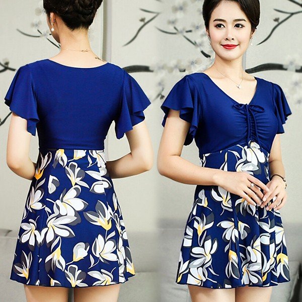 大きいサイズ 水着 レディース 夏らしいマリン風花柄 スイムウェア ママ水着 大きいサイズ 水着ワンピ みずぎ ミニワンピ ミニ丈 夏 パット入りセット