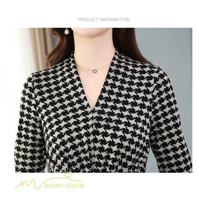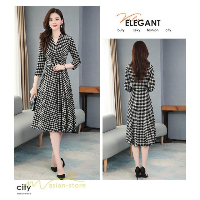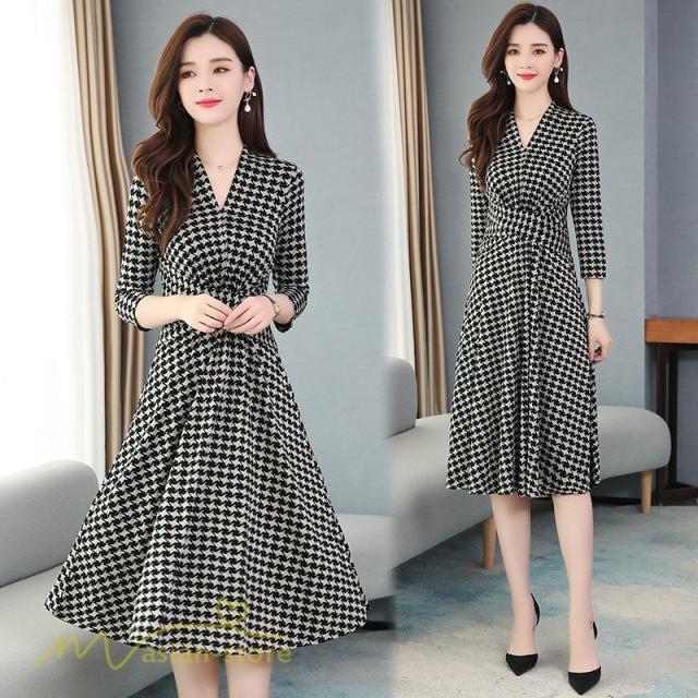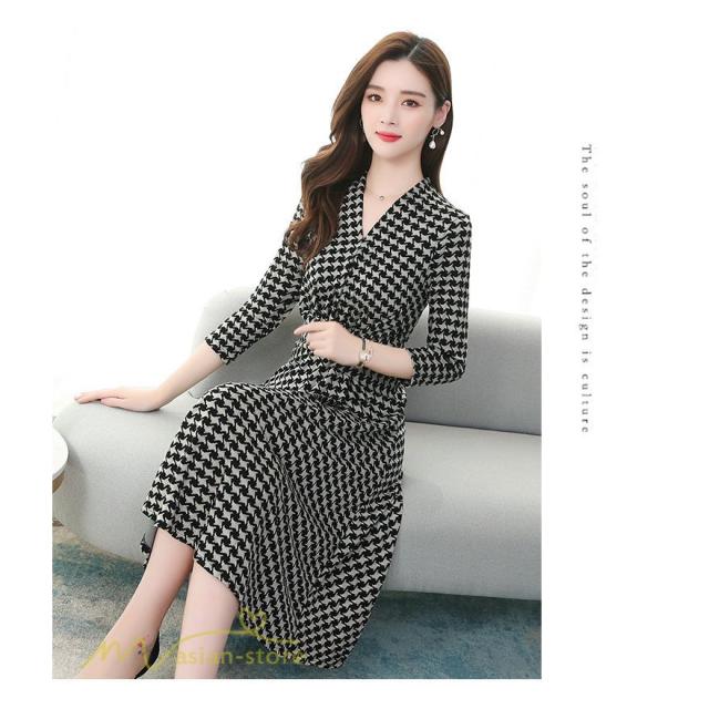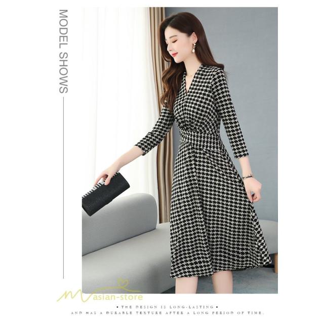 ミディアムワンピース レディース ワンピース 着痩せ Vネック 7分袖 きれいめ チェック柄 夏服 春 夏 秋 着回し 細身 ワンピース ひざ丈 韓国風 女性着 Aライン