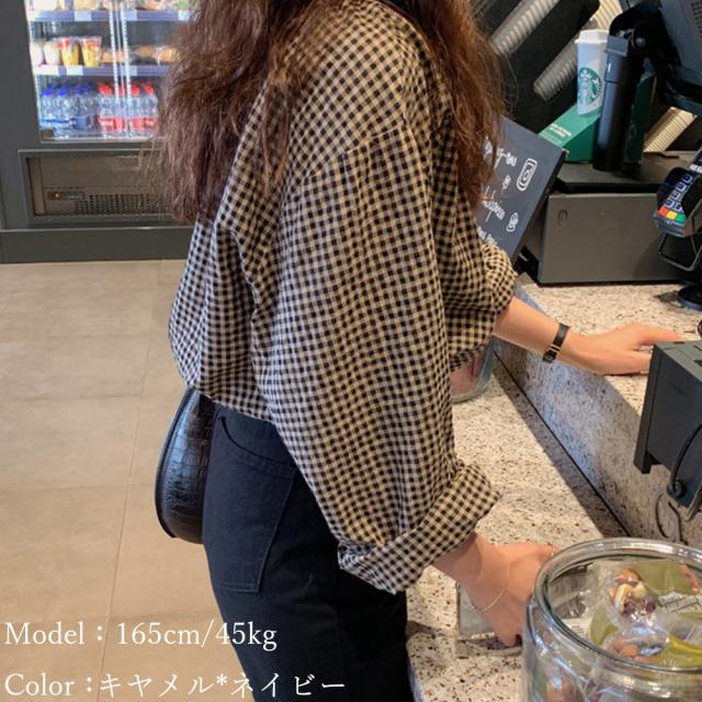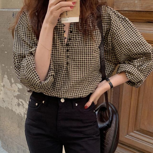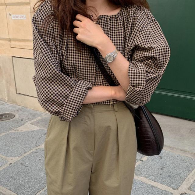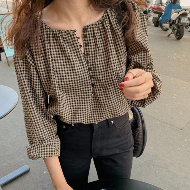 長袖 シャツ レディース チェック スクエアネック ボタン ブラウス 春秋 ゆったり 韓国風