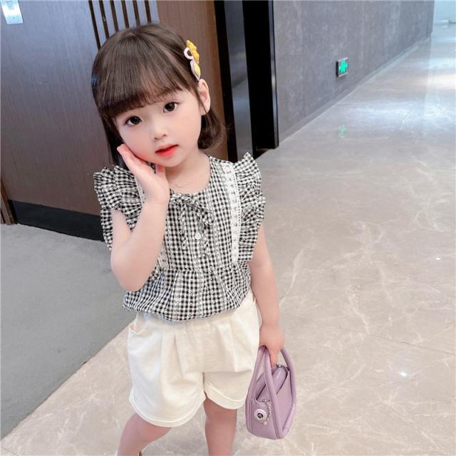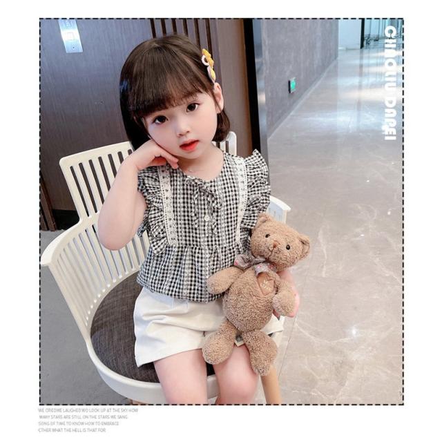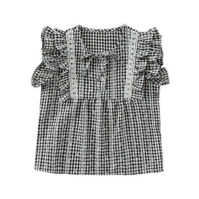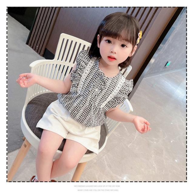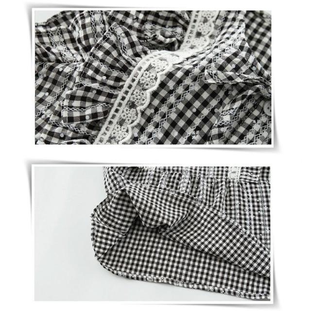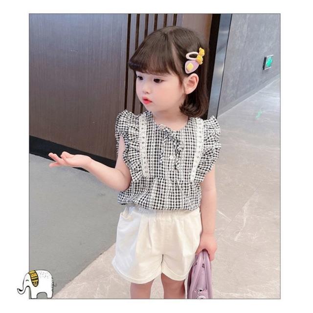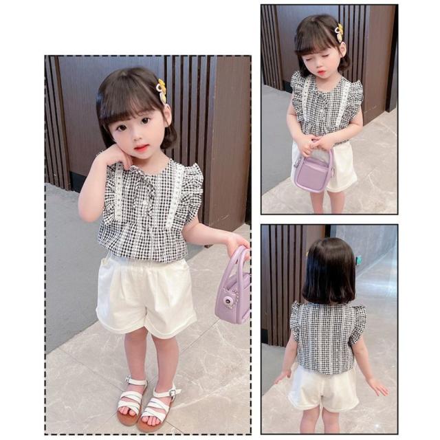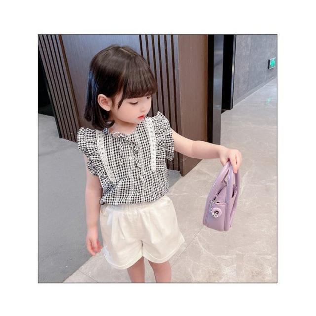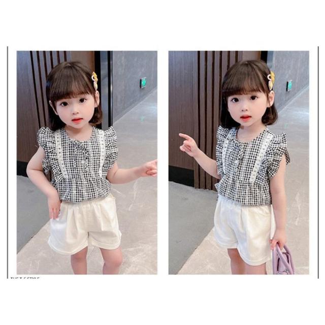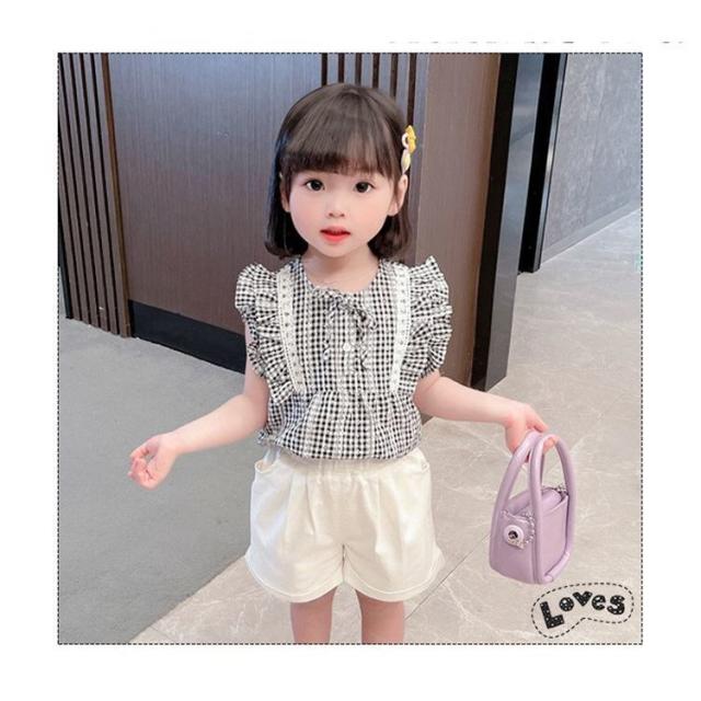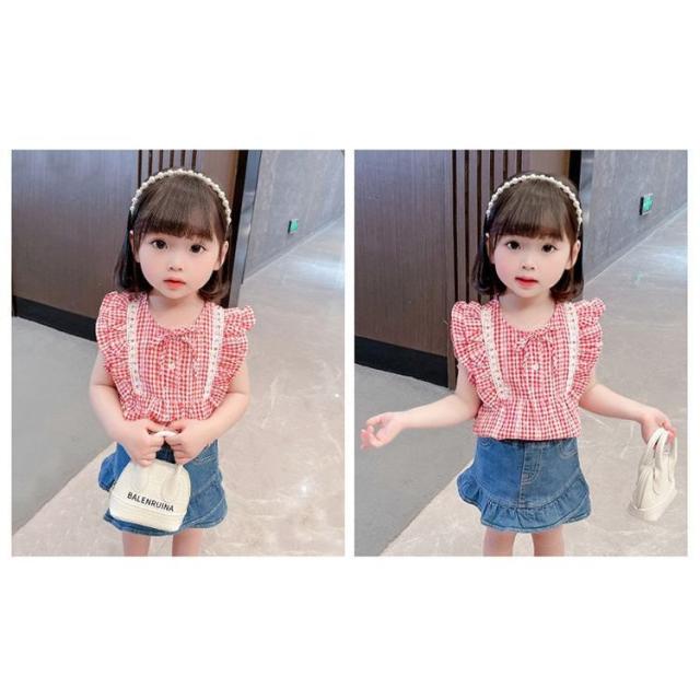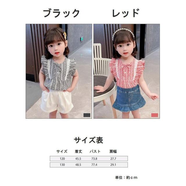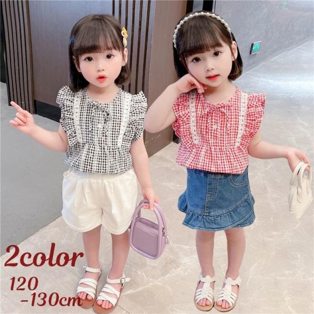 セットアップ 子供服 キッズ 女の子 上下 2点セット フリル袖 半袖 デニムスカート ギンガムチェック レース かわいい おしゃれ カジュアル リボ