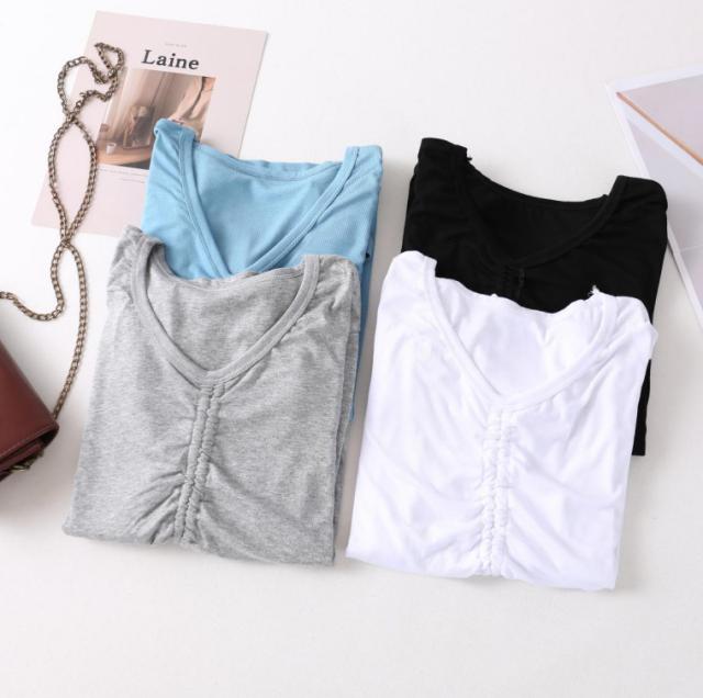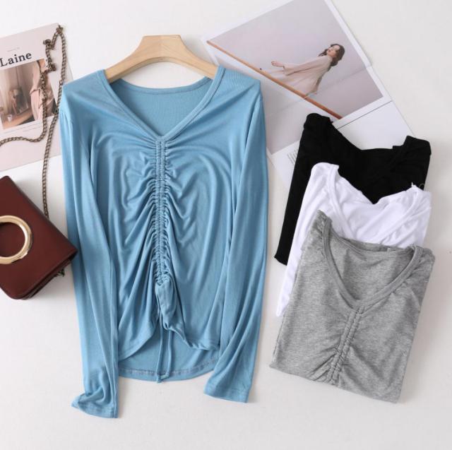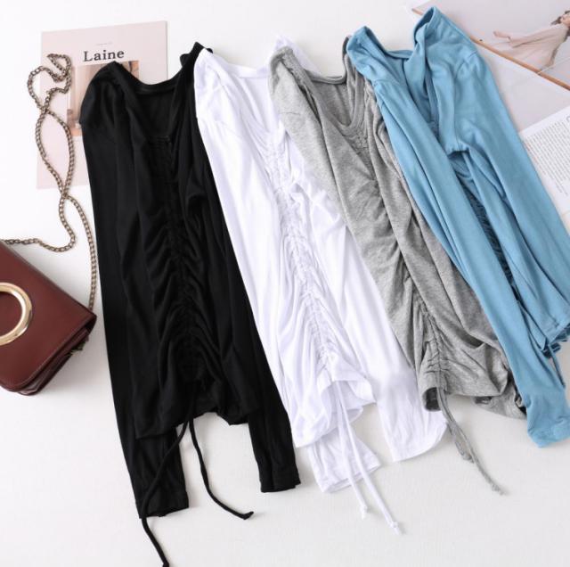 tシャツ レディース フロントギャザー 長袖tシャツ 無地tシャツ Vネック トップス カットソー ひも付き 大人 女性 インナー おしゃれ ブラック ホワイト グレー ブルー