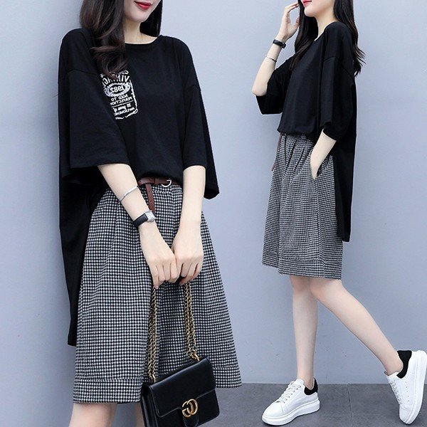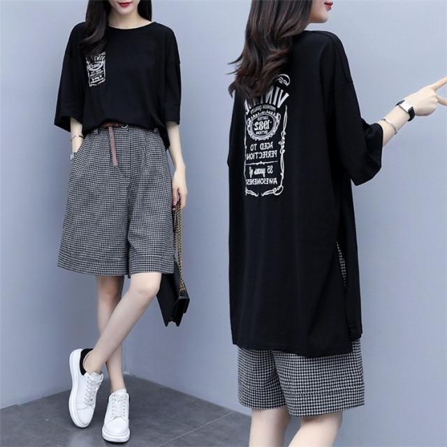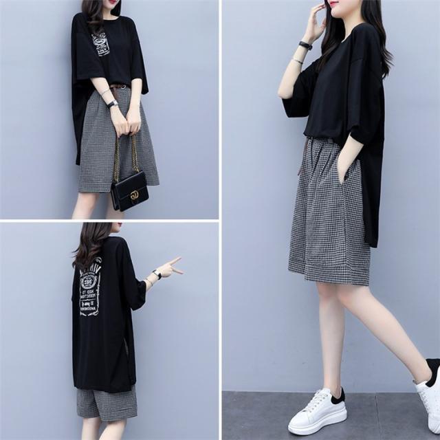 セットアップ レディース 夏 カジュアル 40代 30代 韓国風 上下セット ロングTシャツ 半袖 ガウチョパンツ 綿麻 チェック柄 大きいサイズ おしゃれ 着痩せ 通勤