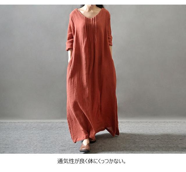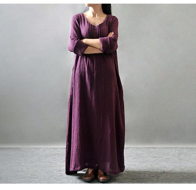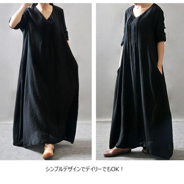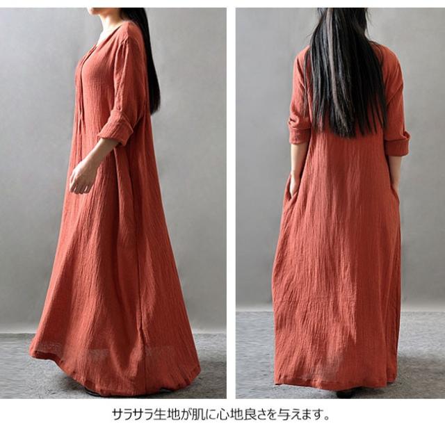ワンピース レディース 綿麻ワンピース マキシ丈 Aライン 民族風 エスニック ゆったり ふんわり シンプル 無地 長袖 Vネック 2020春新作