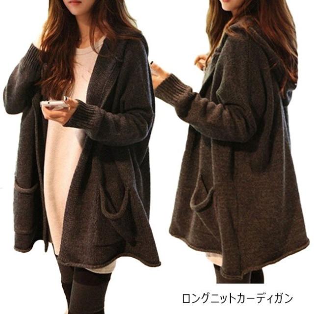 ロングニットカーディガン レディース フード付き リブ編み アウター 無地 長袖 カジュアル 秋 冬 春 2020秋冬新作