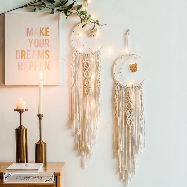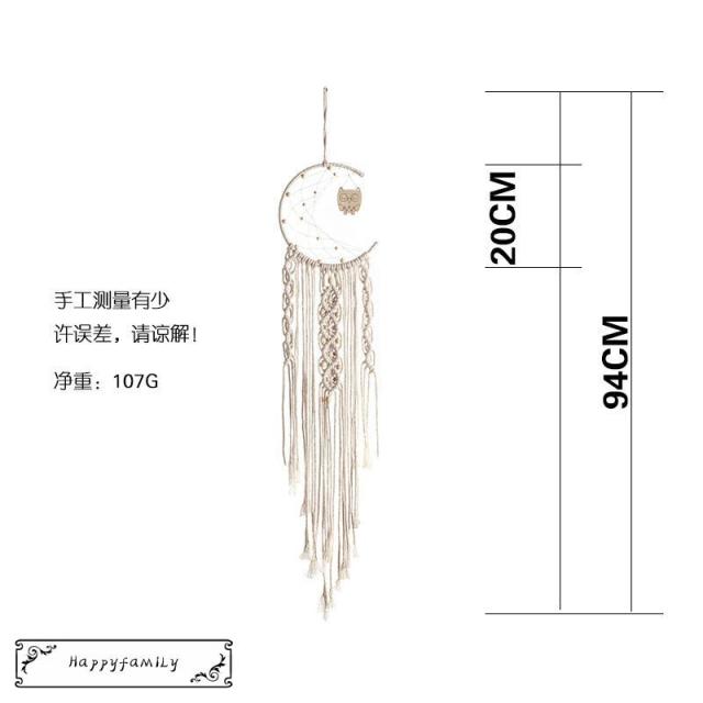 | サイズについての説明 | 幾何学模様で作るマクラメ編みがムーン型でデザインされました。フリンジも可愛く、壁に掛けるだけで手軽におしゃれインテリアを演出できます。ハワイアンや西海岸などサーフ系はもちろん、北欧など優しく自然な感じをお好みの方にもオススメ。リビングや玄関、ベッドルームなど、空いたスペースに飾れば、さりげなくインテリアのおしゃれ度をアップできます。サイズ:全長約94cm、編み部分約20cm |