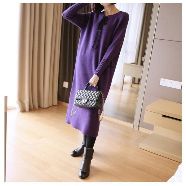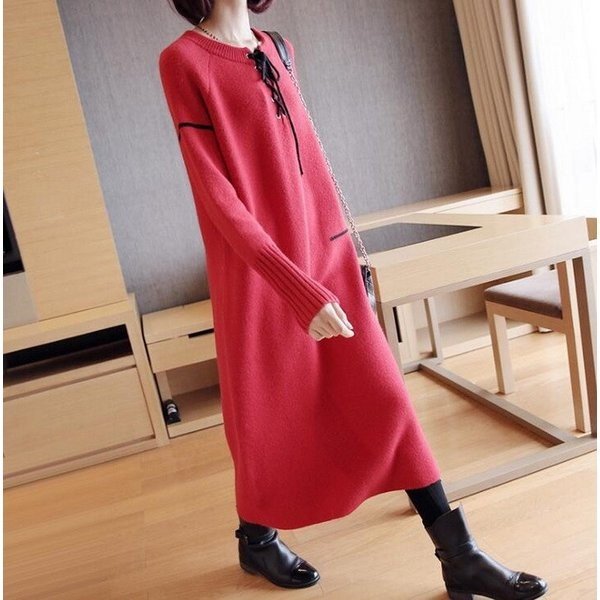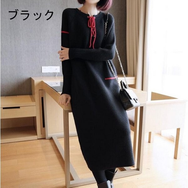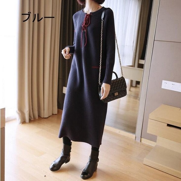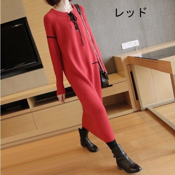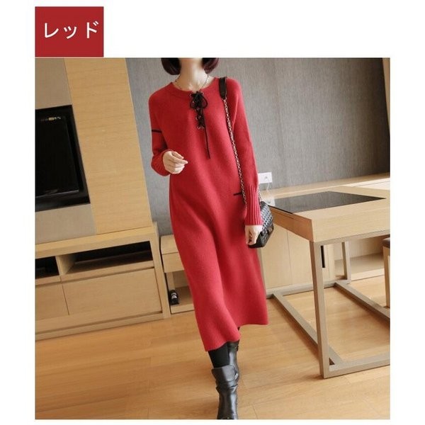 ニットワンピース レディース 長袖 ロングワンピース Uネック レッド パープル ブルー ブラック 人気 大人 上品 秋冬新作