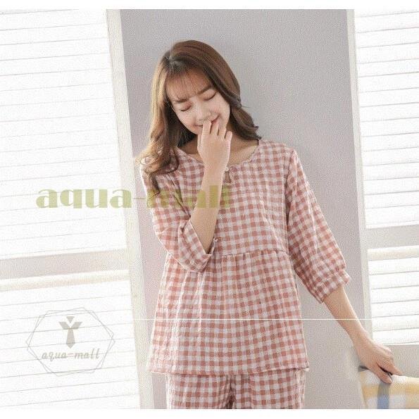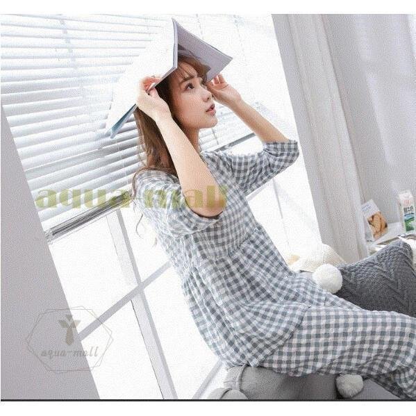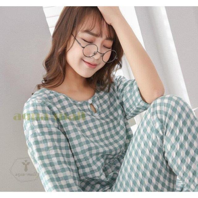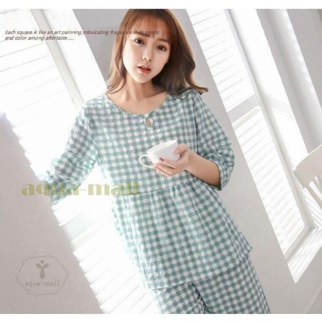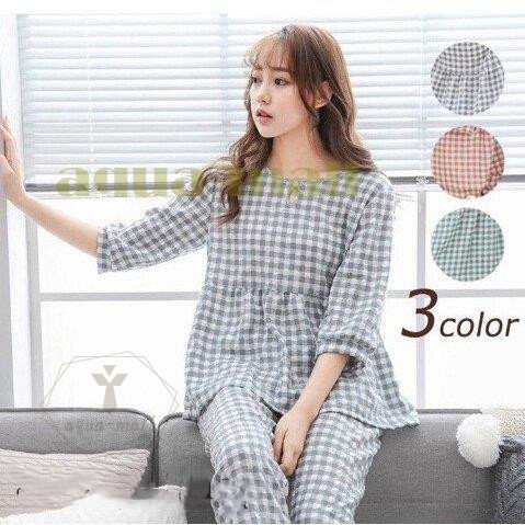 2点パジャマ レディース 春夏秋 チェック柄 パジャマ 可愛い 綿 七分袖 大きいサイズ ロングパンツ 上下セット ルームウェア 女性 部屋着 寝巻き 3色