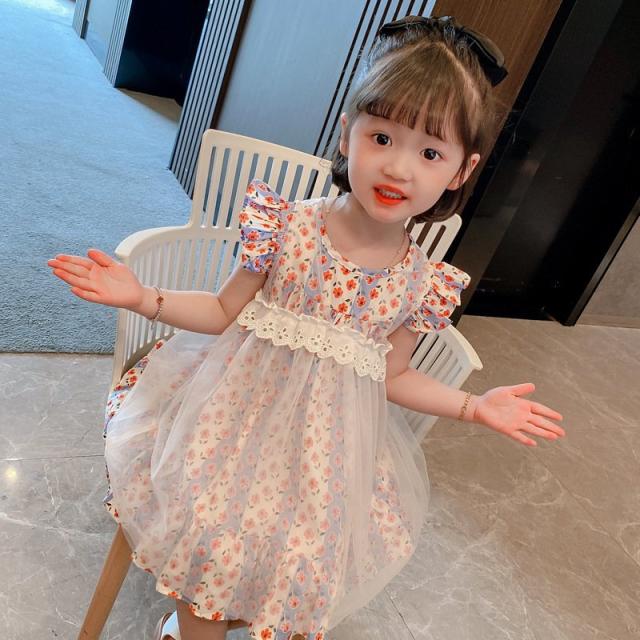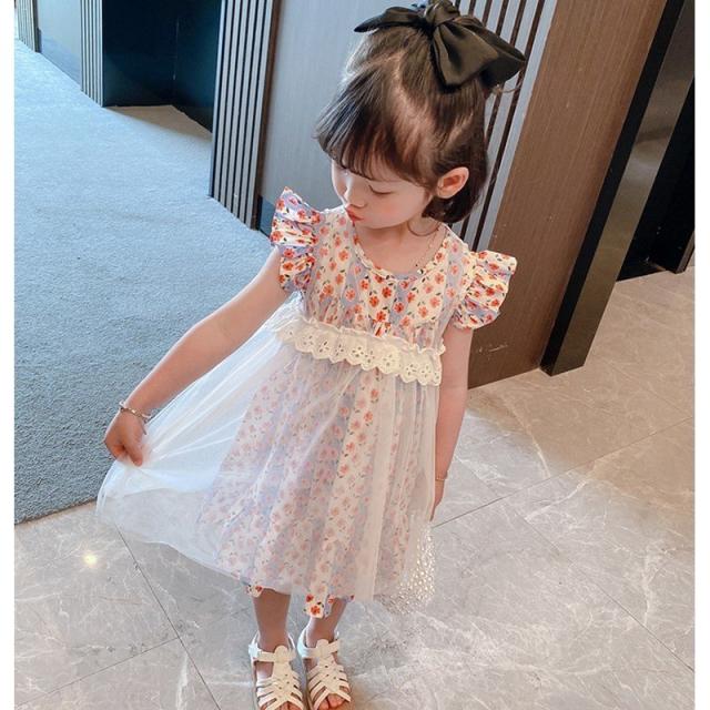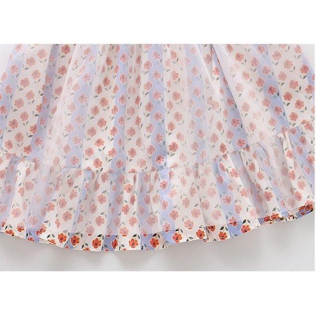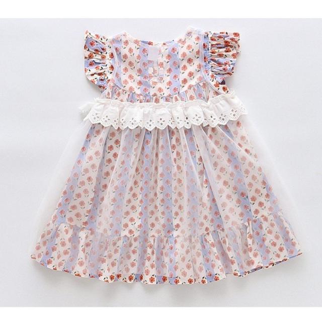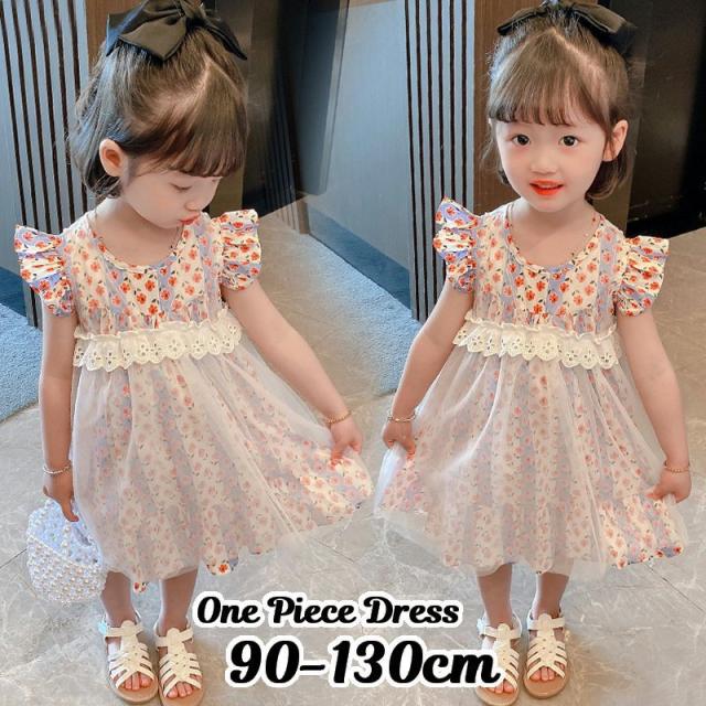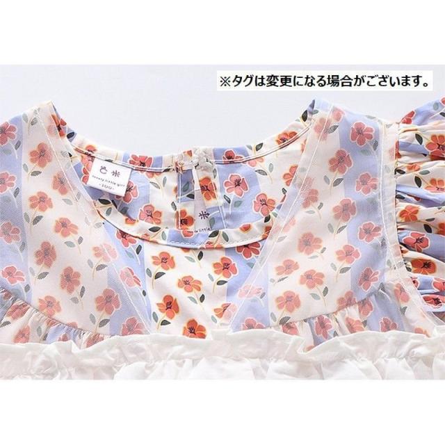ワンピース 子供服 キッズ ベビー 女の子 カジュアルドレス ノースリーブ フリル襟 膝丈 ギャザー 裾フリル チュールレース メッシュ フラワープリ