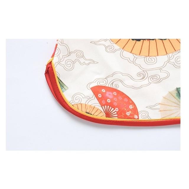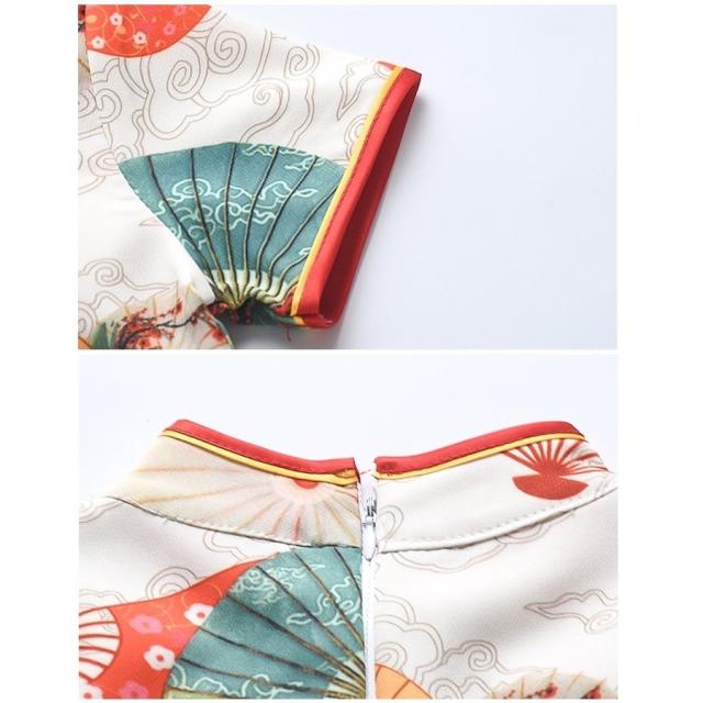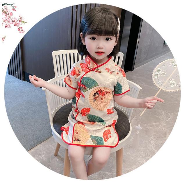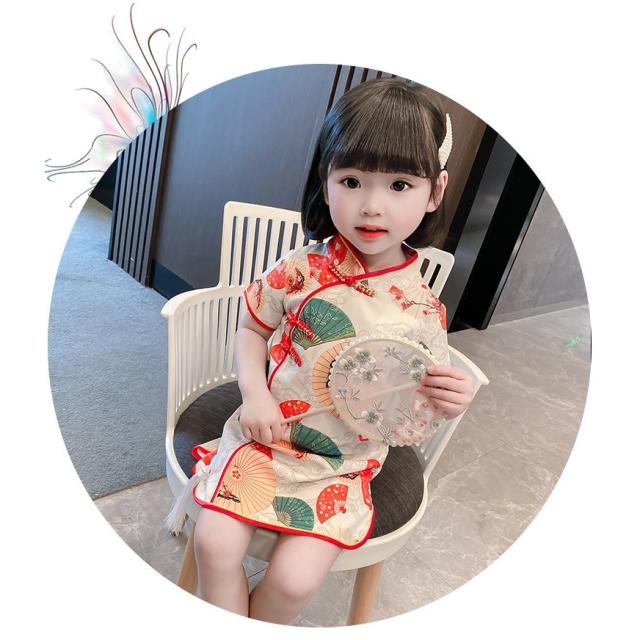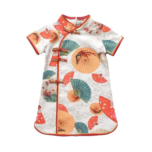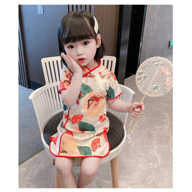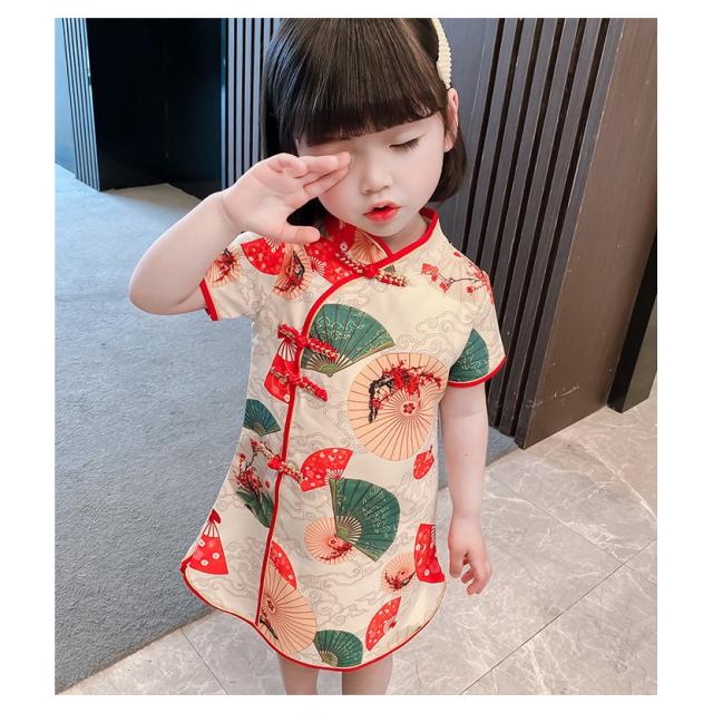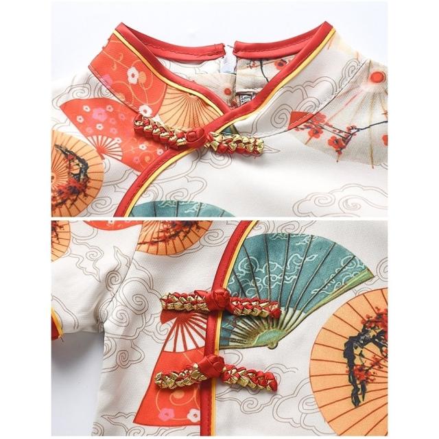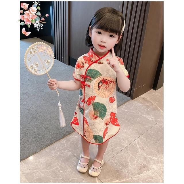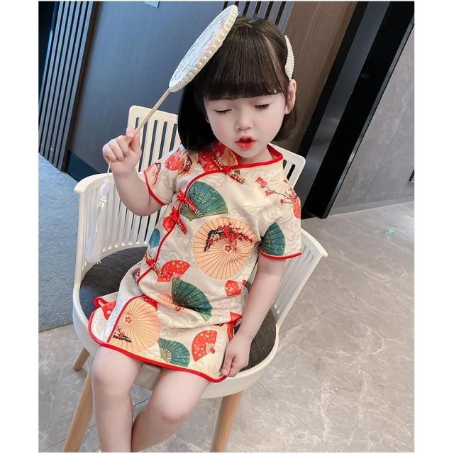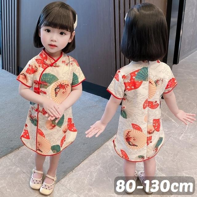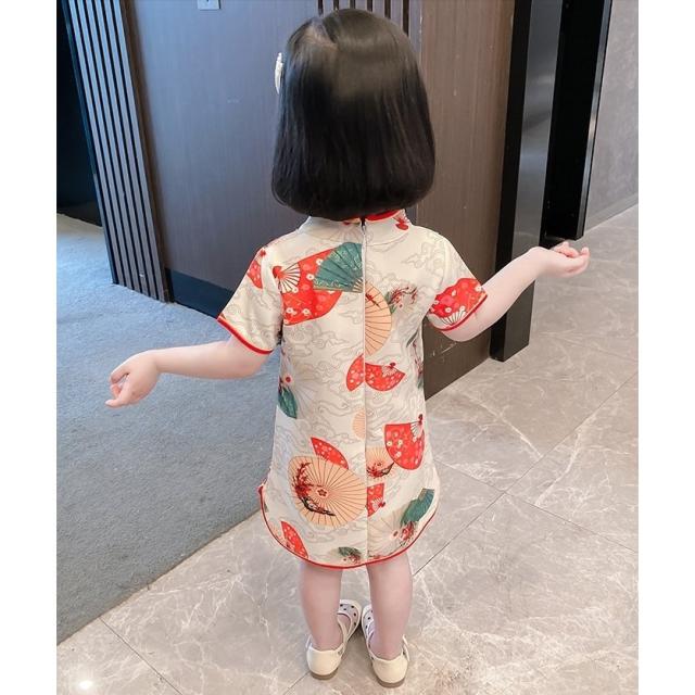 ワンピース 半袖 キッズ ベビー 子供 女の子 膝丈 Aライン マオカラー チャイナドレス風 中華風 レトロ調 扇子柄 華やか 上品 可愛い おしゃれ